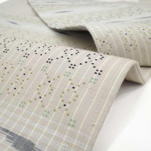 お太鼓柄や前柄には、手括りの霞がかった絣模様とともに、藍色やグリーン系の細やかな花織がふわりと浮かび上がり、全体にほんのりと華やぎを添えてくれます。