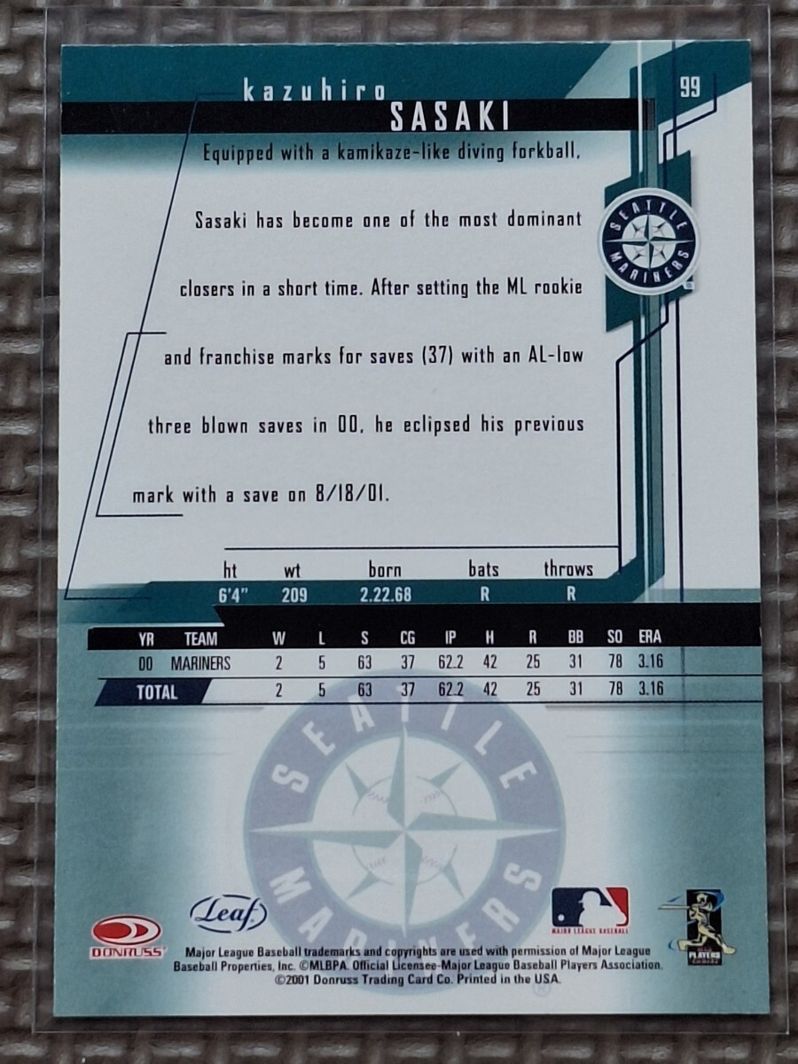 2001 Donruss Leaf Rookies & Stars #99 KAZUHIRO SASAKI Seattle Mariners Yokohama Taiyo Whales
