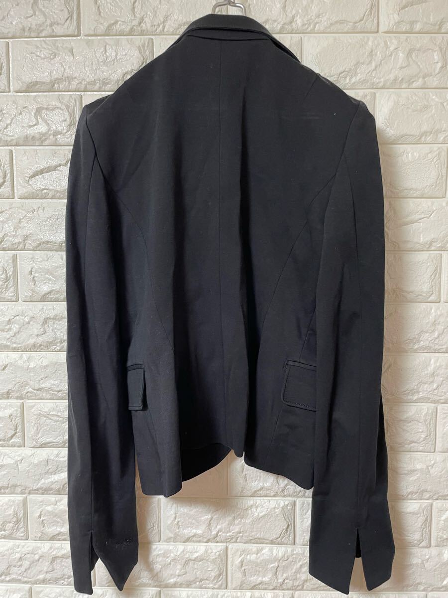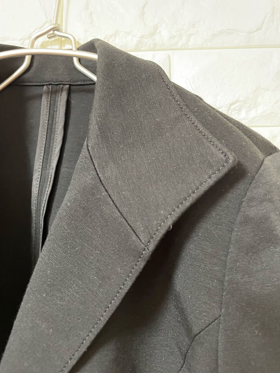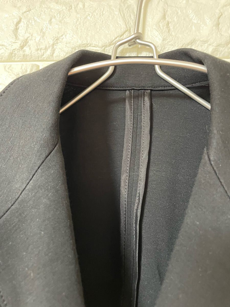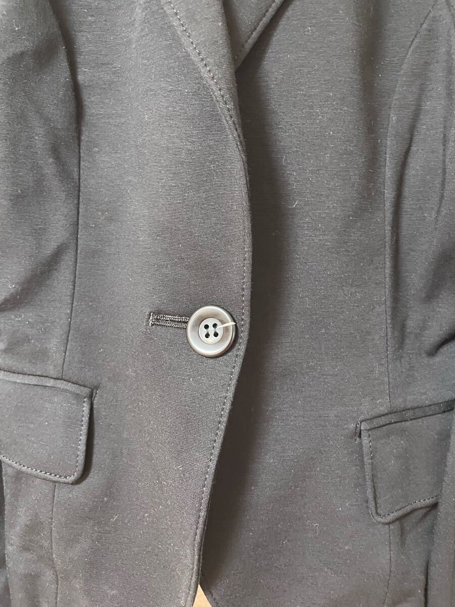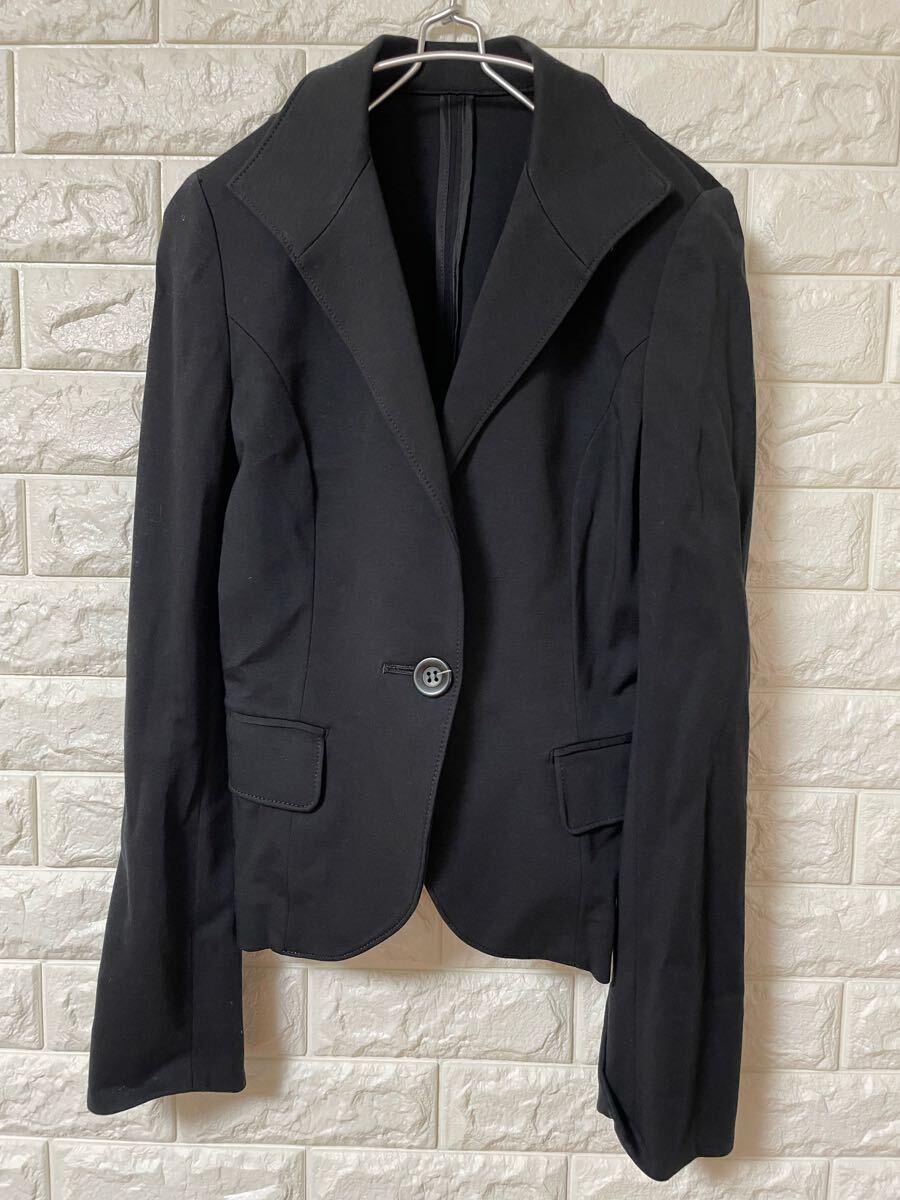シングルボタンの黒いテーラードジャケット、ピークドラペルデザイン。