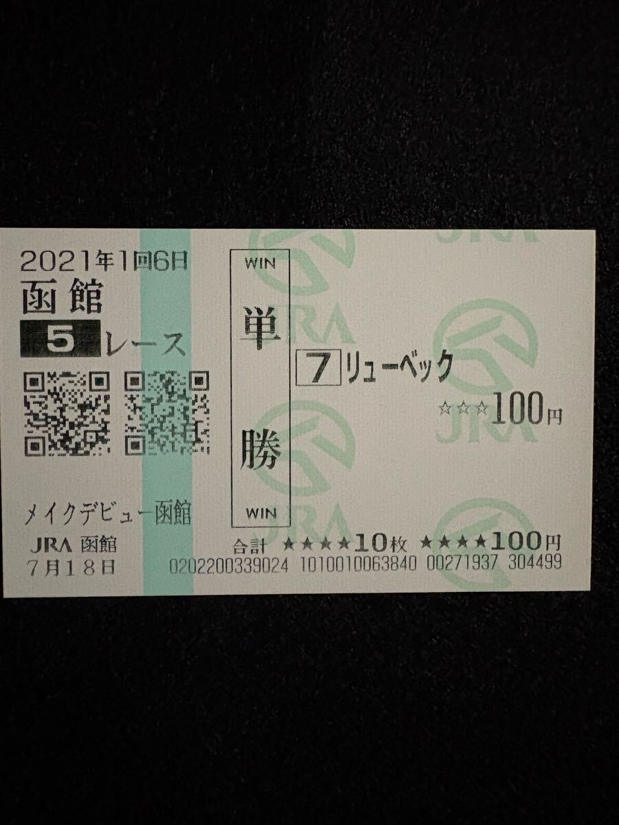 リューベックがメイクデビュー函館に出走した際の、現地的中単勝馬券です。