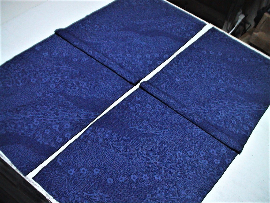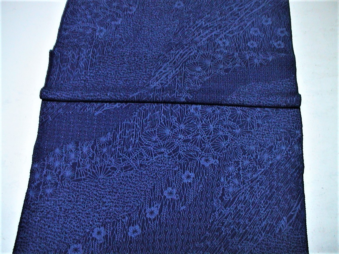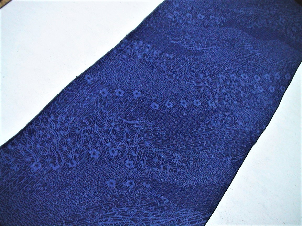 着物はぎれ(古布)正絹鬼しぼ縮緬 群青道長取り模様 (35x194cm)