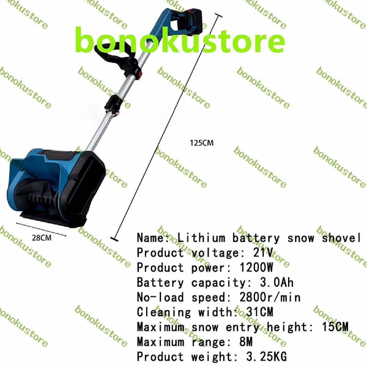 製品名: リチウム電池雪かき 製品電圧: 21V 製品電力: 1200W バッテリー容量:3.0Ah 無負荷速度: 2800r/min クリーニング幅: 31CM 最大積雪高さ: 15CM 最大範囲: 8M 製品重量: 3.25KG