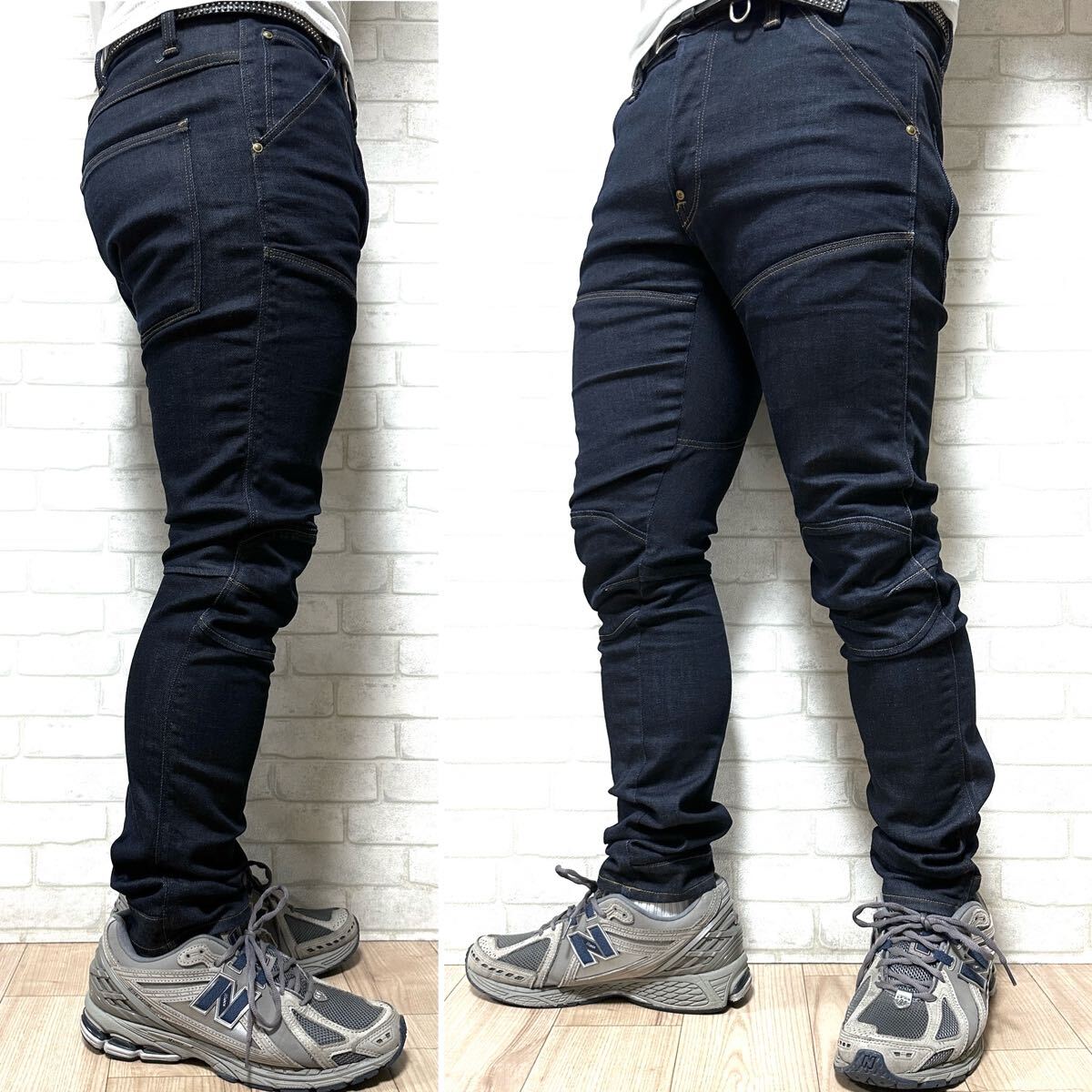 ☆ストレッチデニム素材を使用した伸縮性のある快適な穿き心地◎更にヒップ部分、膝部分には別布が配されたダブルニー仕様。また、膝部分には3Dシェイプダーツ、裾口にはヒールガードを配したライダー、バイカージーンズからパターン起こし再現した一本です。