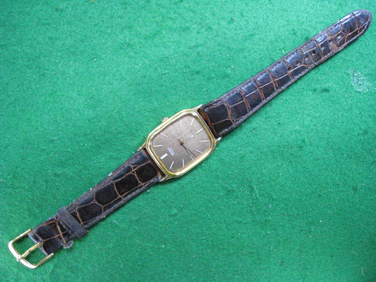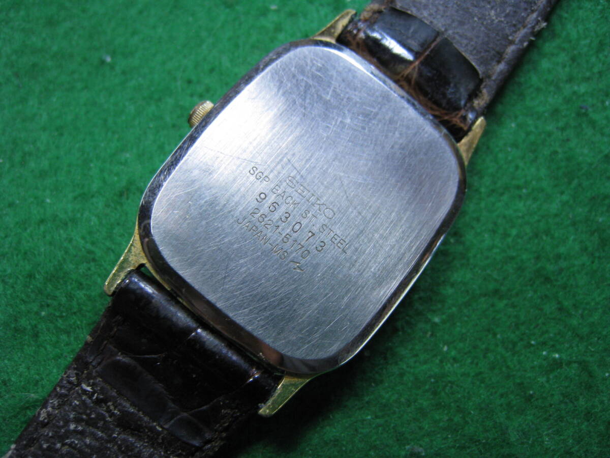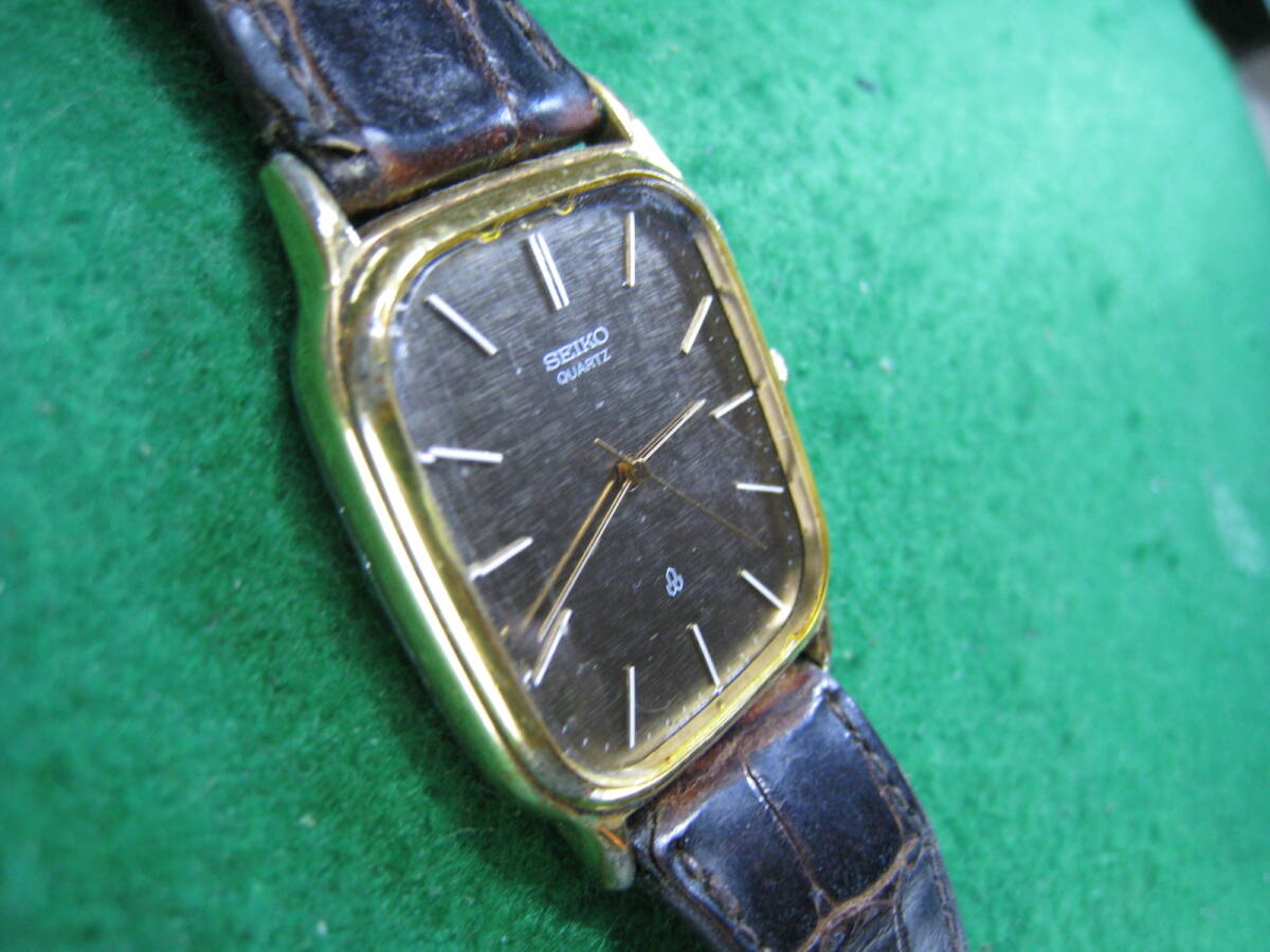 とてもシンプルで上品なデザインの SEIKO メンズ ヴィンテージQZ SGP金色ケースです。こちらもかなり古い時計です。風防は小キズ数個程度で目に付くような大きなキズやスレは見られません。ケースはSGP金色で経年の割にはキレイな金色をしていてハゲやカケなどは見られません。文字盤は金色屏風のような質感で、大きなイタミは見られません。裏蓋は経年使用で刻印は見にくくなってますが、全て読み取ることはできます。ベルトも古いものが着いていて、遊環が一つ欠損しています。尾錠も金色で使用は可能かもしれませんがオマケと思ってください。現在も正常に稼働していますが電池交換から時間が経過していますので、到着時の電池切れはご容赦ください。実用にコレクションにいかがでしょう。