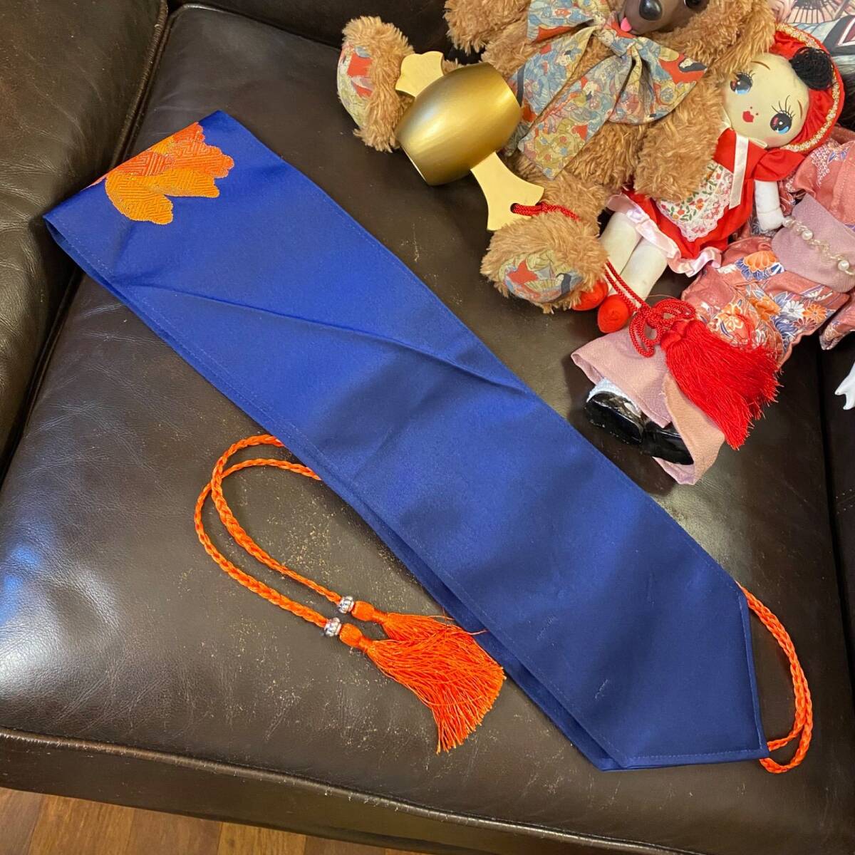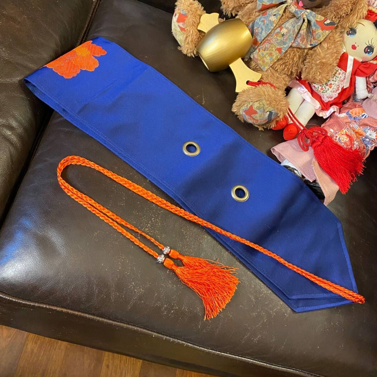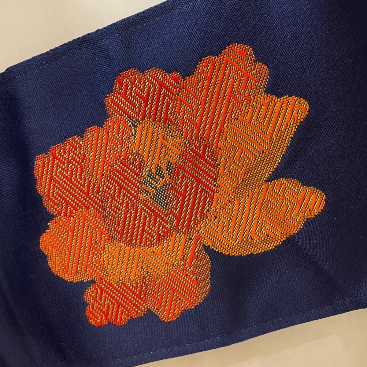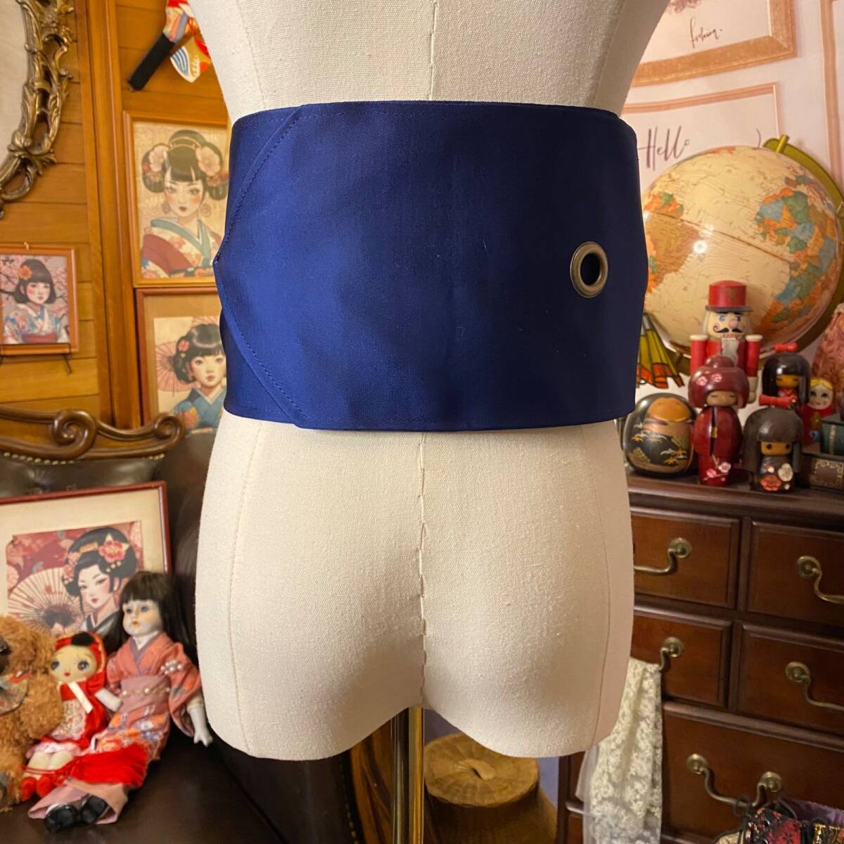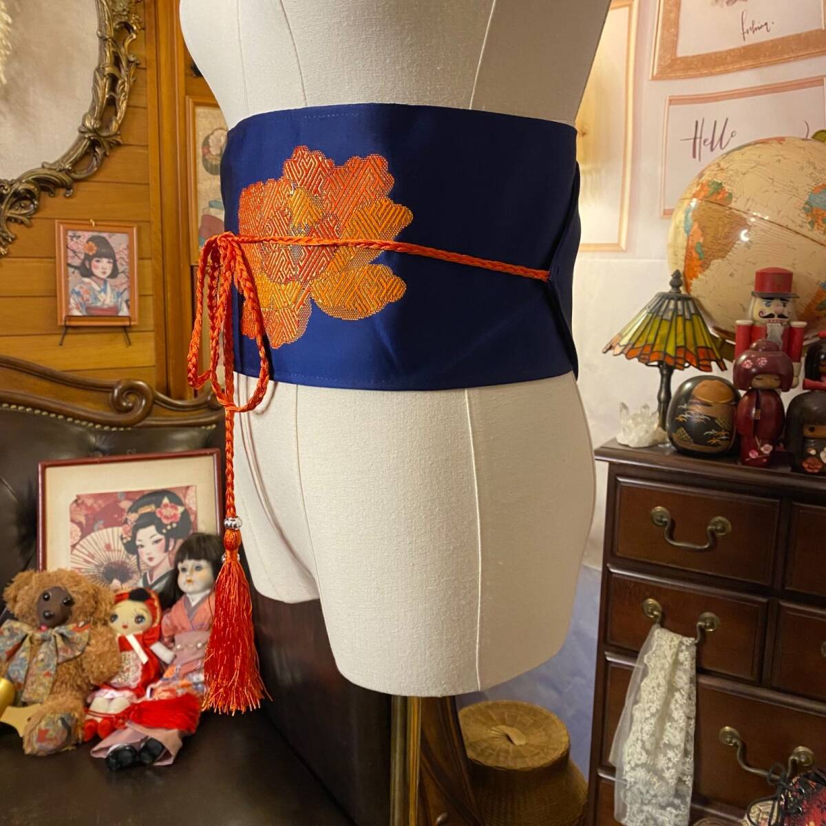 【名古屋帯 リメイク サッシュベルト 飾り帯 和洋折衷 ハンドメイド レトロ 古着 L〜LL対応 群青を裂く、一輪の熾火。 ROB-111】