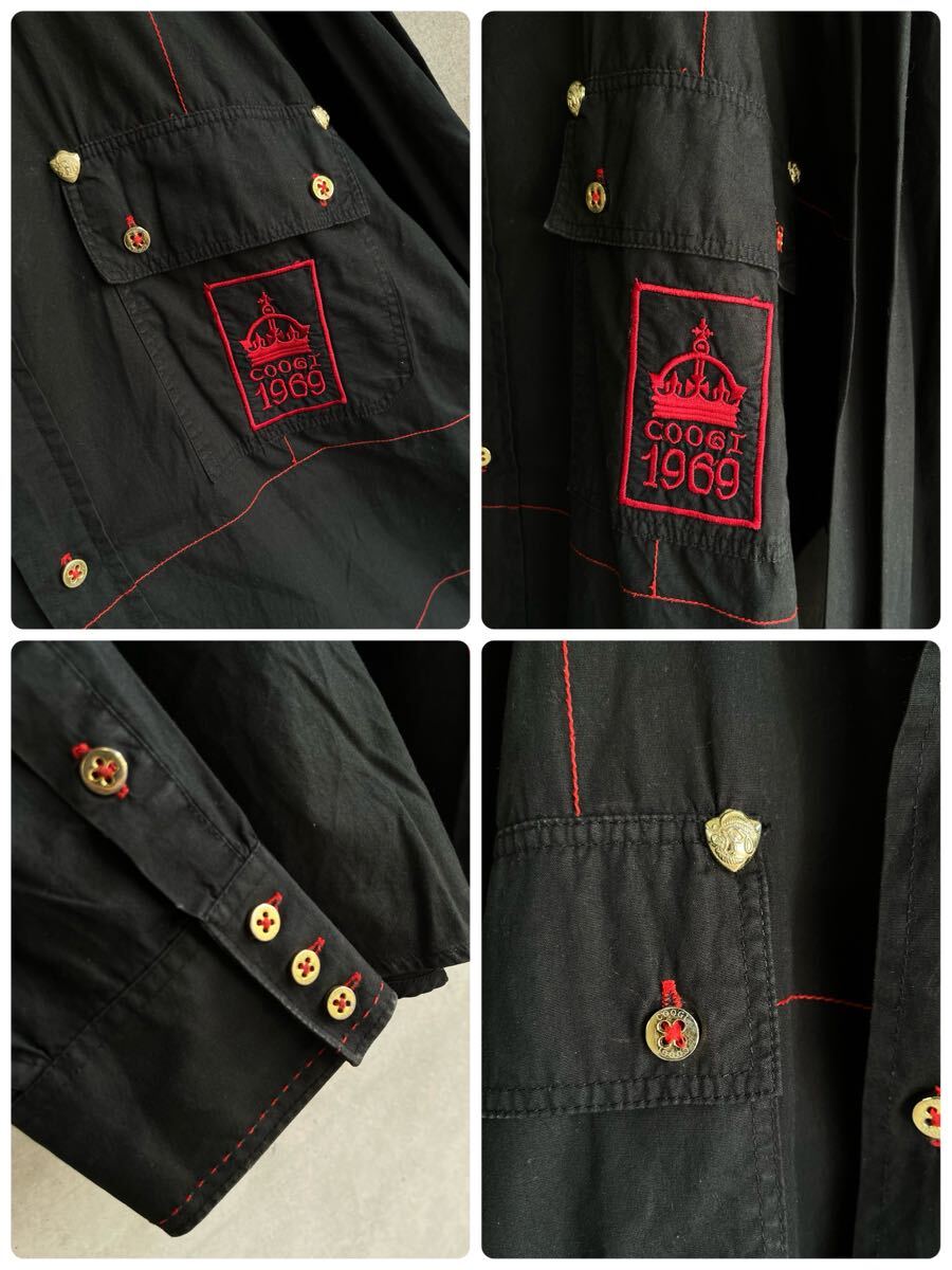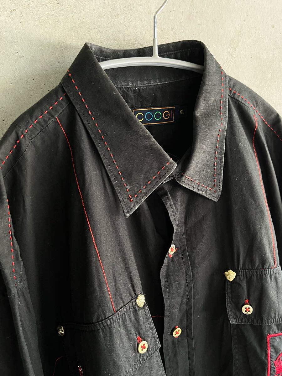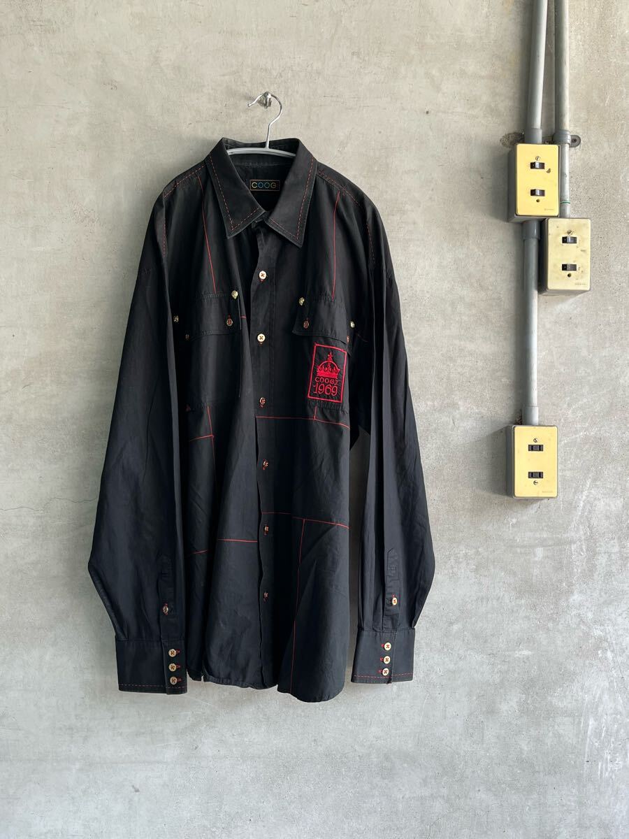 80s 80年代 90s 90年代 coogi クージ 刺繍 パイピング ビンテージ 長袖シャツ 黒 金 赤 古着 ビッグサイズ 綿 Euro ユーロ イタリア XXL