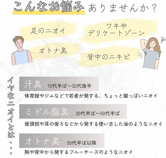 【こんな方に】赤ちゃん、子供から大人までどなたでも。 加齢臭や体臭などニオイの原因となる汚れを洗い流します。 敏感肌の方、デリケートゾーンのケアにも。 髪の長い方はボディシャンプーとして。