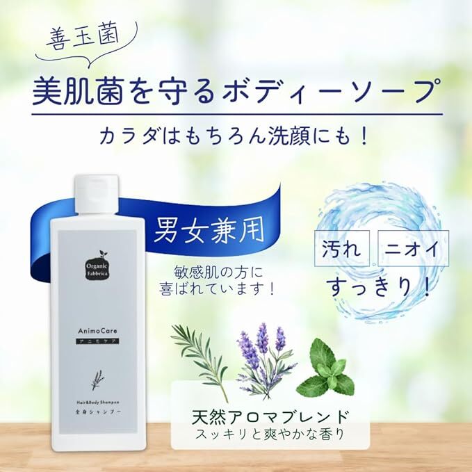 肌の善玉菌を守るボディソープ。肌がデリケートな方、ニオイが気になる方にオススメします。 さっぱりしながらも、素肌にうるおいを残す使用感を追求しました。 また、天然アロマの香りで心と体がほぐれます。