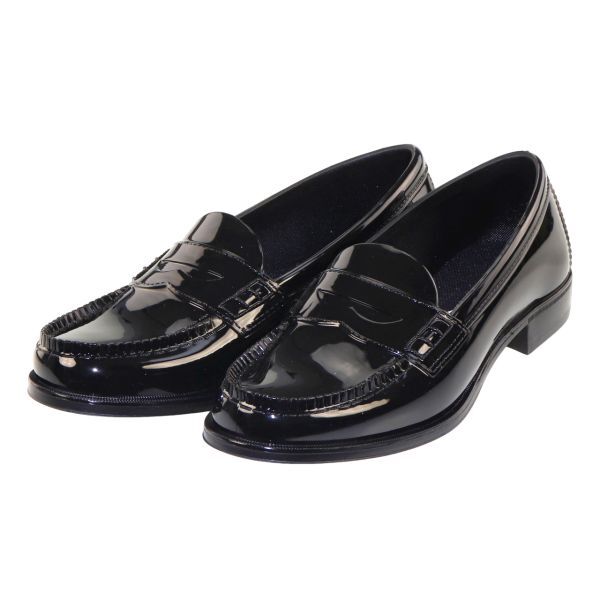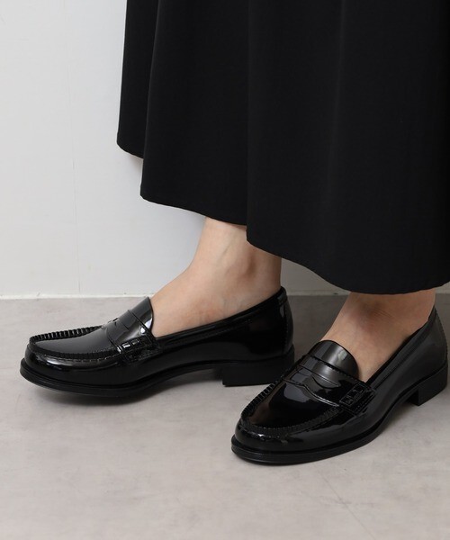 ツヤ感のある上品なエナメル調仕上げで足元をエレガントに演出。にわか雨に備えて、おすすめの晴雨兼用ローファーです。