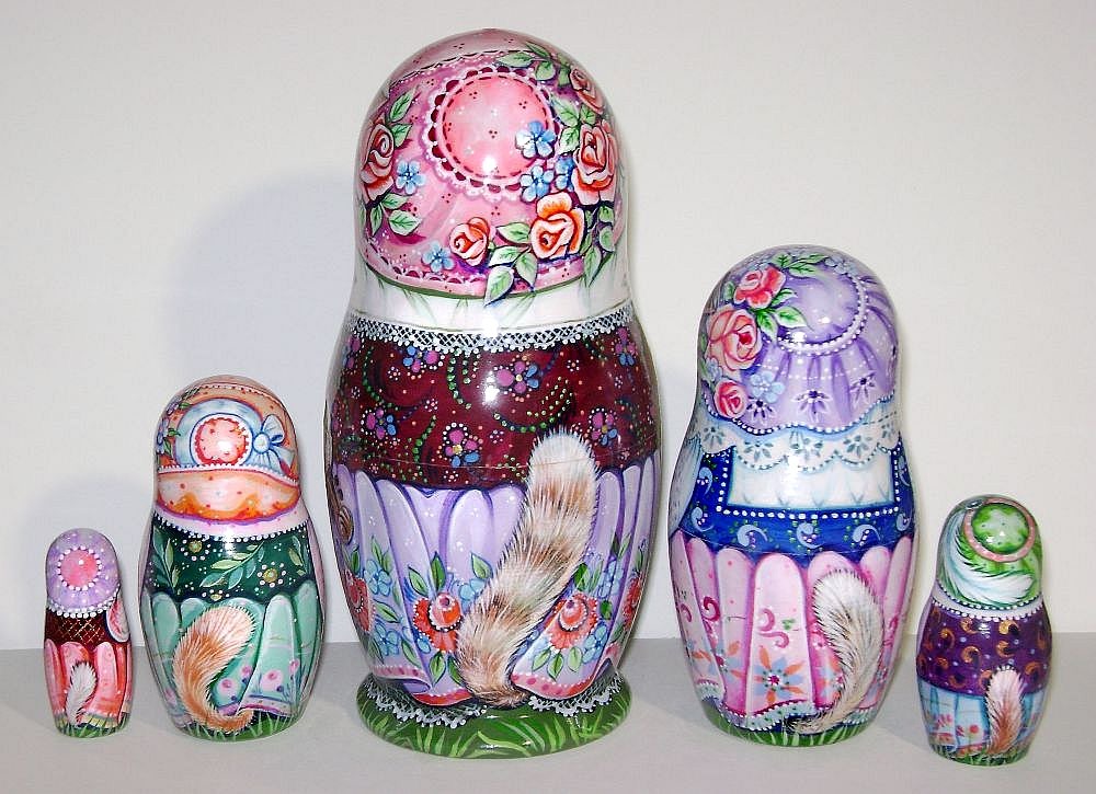 つぶらな瞳でとても優しい表情の1番大きな猫はバイオリンを弾いています。ゴージャスなひだプリーツのスカートの裾に描かれているバラ模様は、モスクワの東方、ヴォルガ川とオカ川の合流点に広がる大都市ニジニ・ノヴゴロド州のゴロジェッツ塗りの伝統柄です。