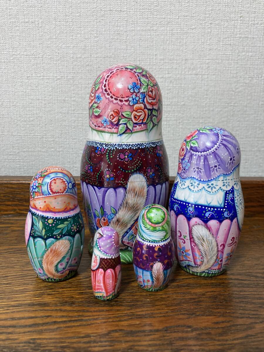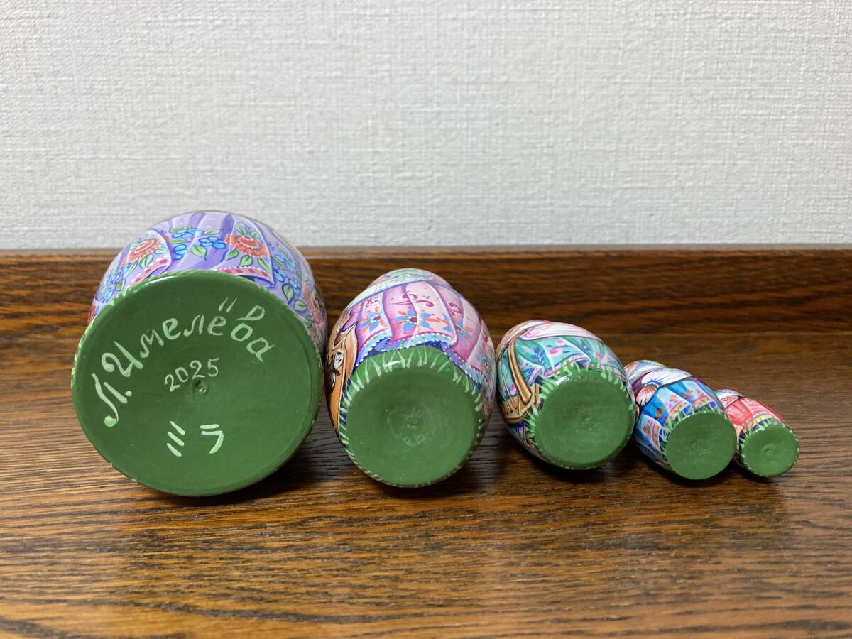 こちらのマトリョーシカは水彩絵の具とアクリル絵の具で描かれており、半艶消しニスで仕上げられています。水彩絵の具で木が透けて見えるので、絵に軽やかさと重なりが生まれています。