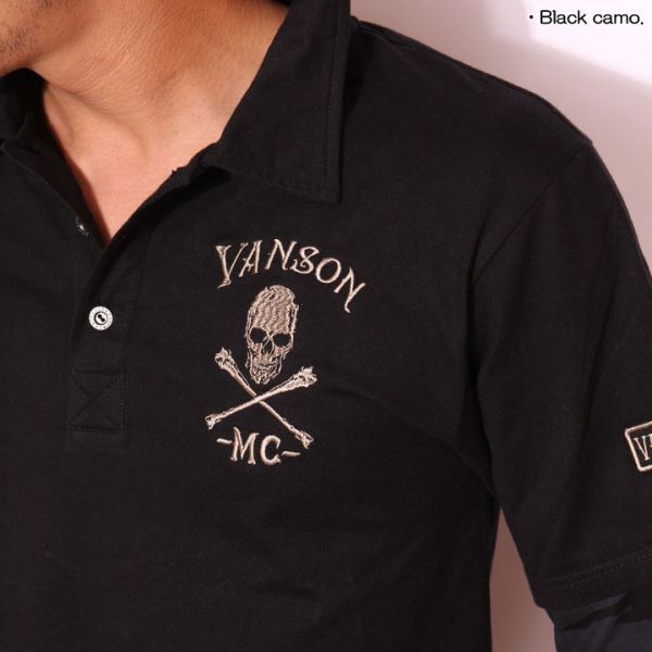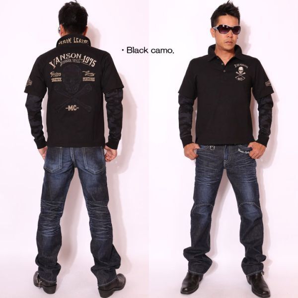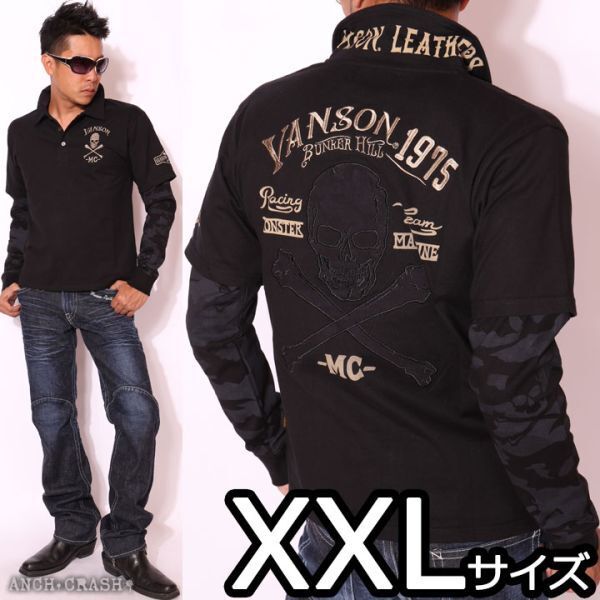 当店別注 VANSON バンソン フェイクレイヤード 長袖 ポロシャツ ブラック×袖ブラックカモ【XXLサイズ 】NVPS-519 バイカー アメカジ 刺繍