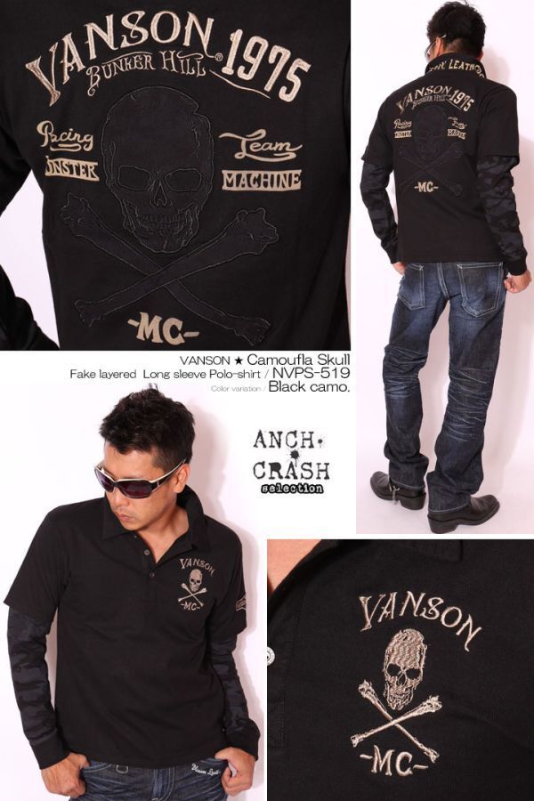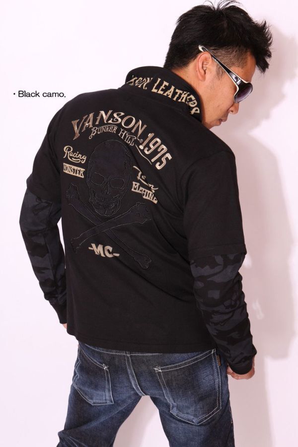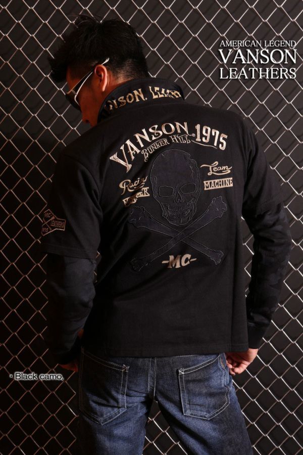 『アメリカが生んだ革の魔術師』高品質で世界中に愛される伝説のバイカーズブランド【VANSON(バンソン)】、カモフラ スカル 刺繍 フェイクレイヤード 長袖ポロ!