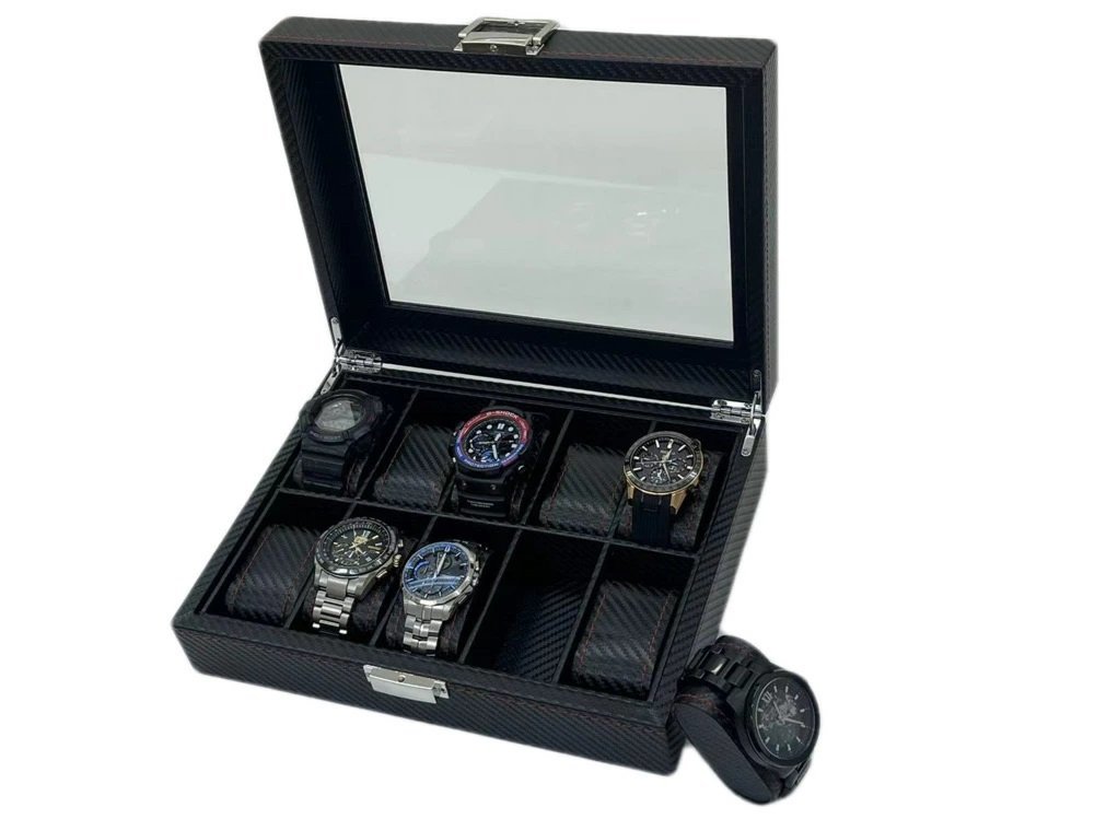 素材/サイズ:木製+カーボンファイバー+ガラス、10本入り「横幅28cm×奥行21.5cm×8cm」(腕時計スペース 横幅46mm×奥行き90mm)重量:1.32kg
