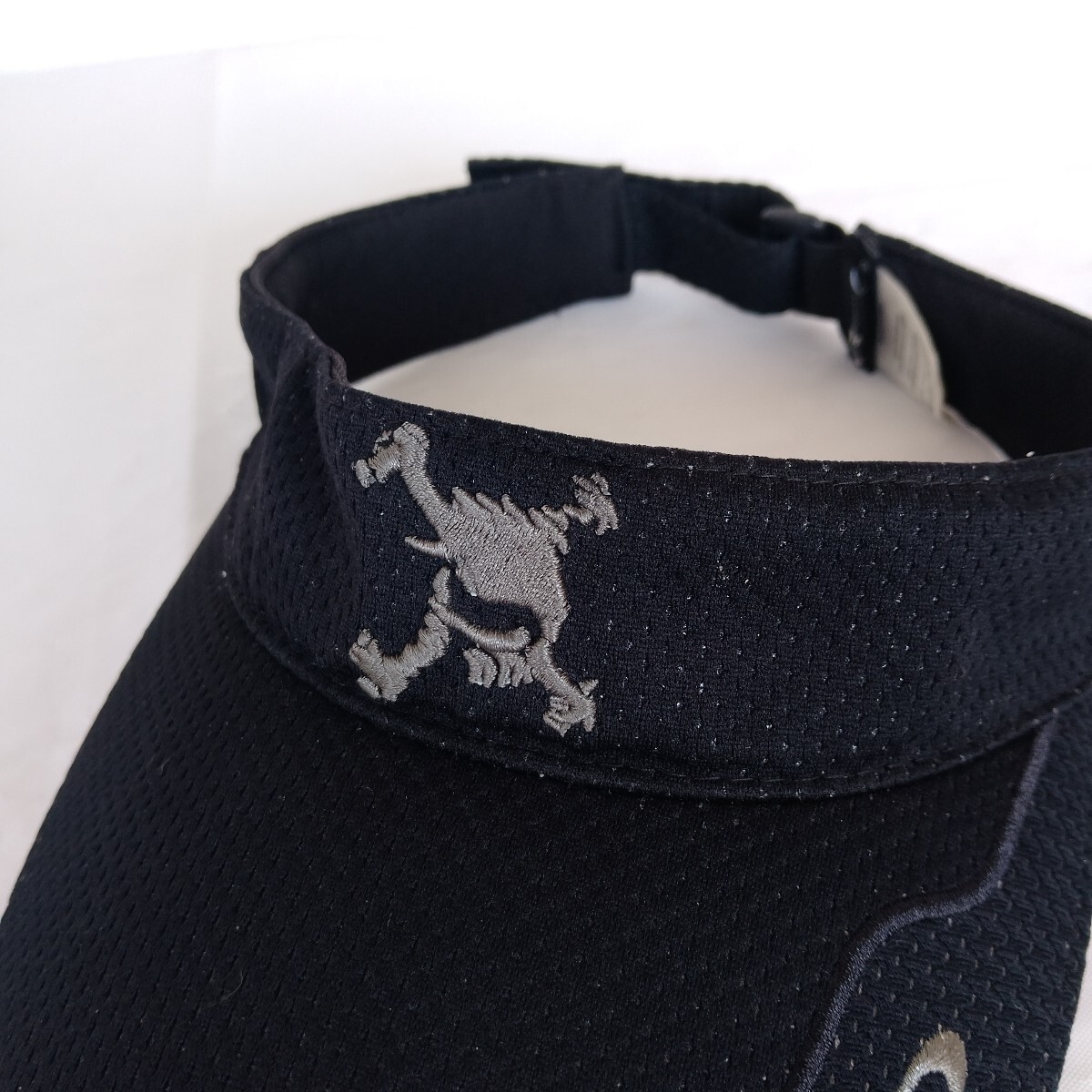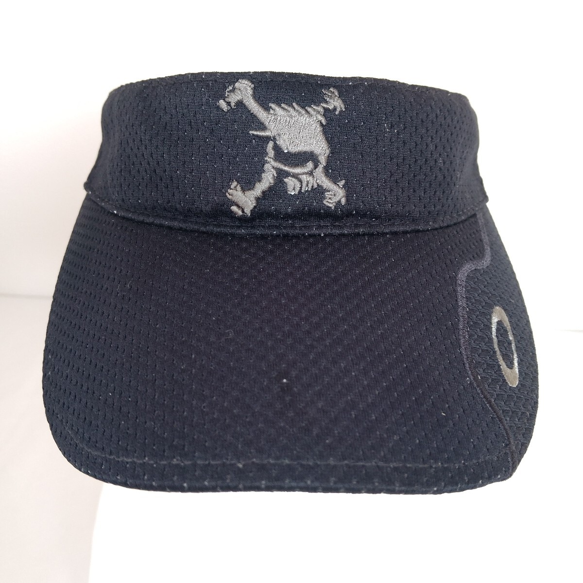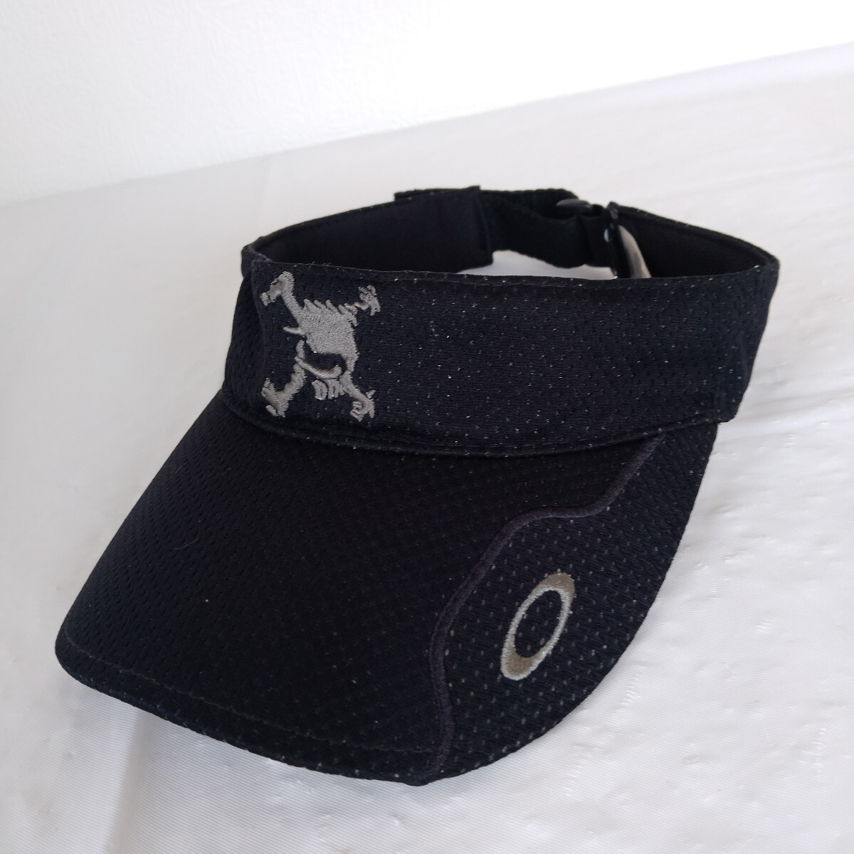 OAKLEY 黒 バイザー です。フロントには『オークリー』のグレーのロゴ刺繍、ツバにも『』のロゴ刺繍、バックは調節機能付きです。