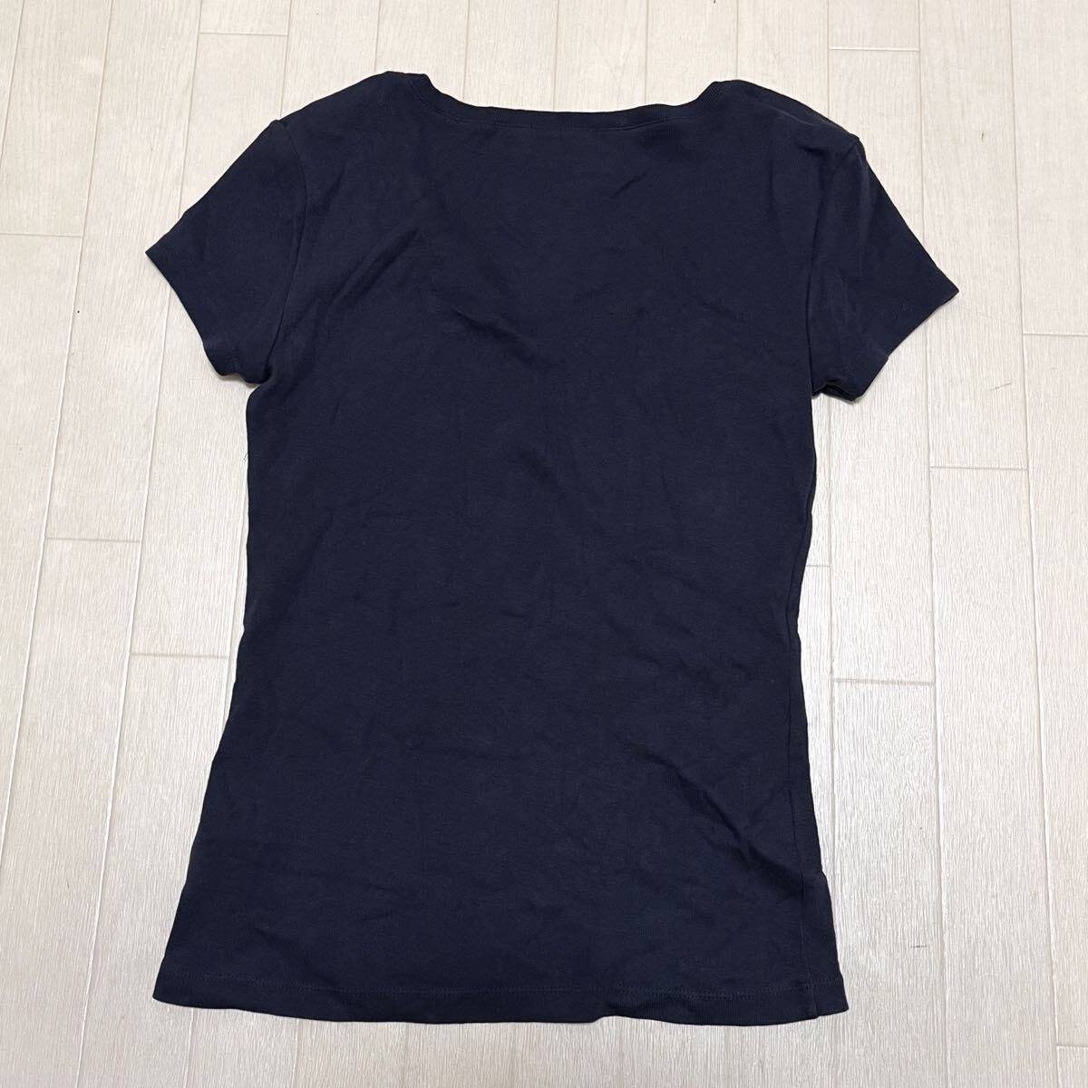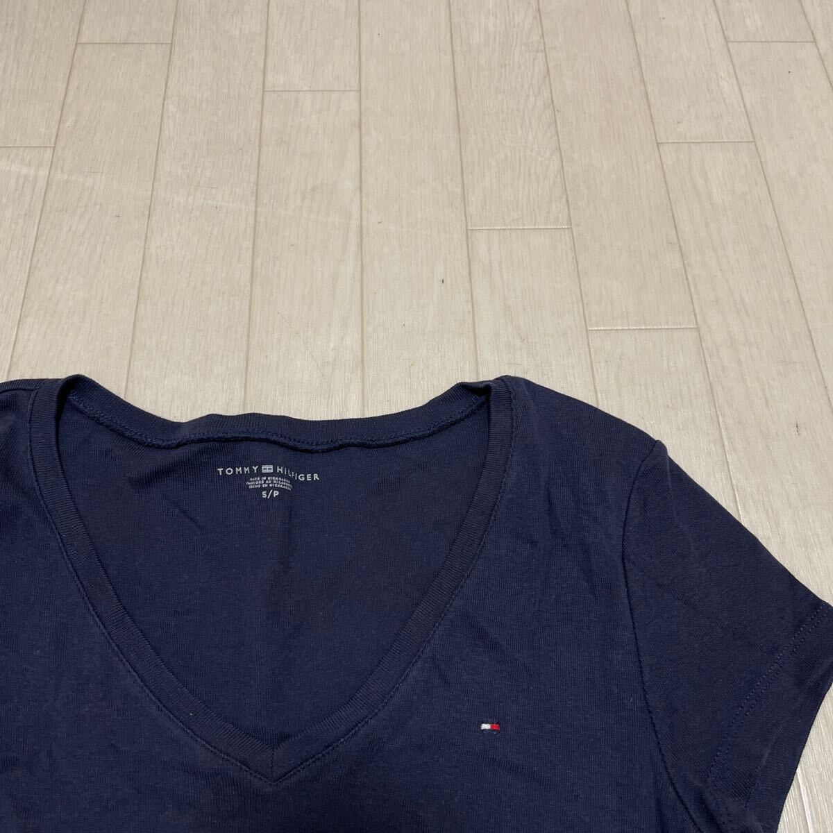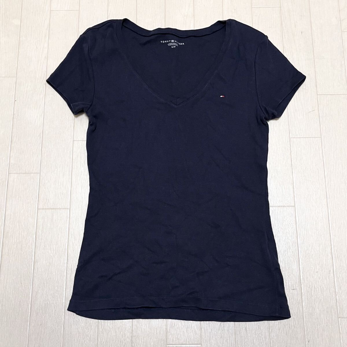 和764★ TOMMY HILFIGER トミーヒルフィガー 半袖 カットソー Vネック ワンポイント刺繍 S ネイビー レディース