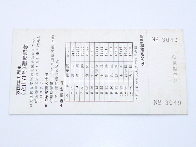 記念切符★万国博列車〈立山71号〉運転記念 普通入場券★金沢鉄道管理局★昭和45年6月5日★1枚★富山駅発行★3049