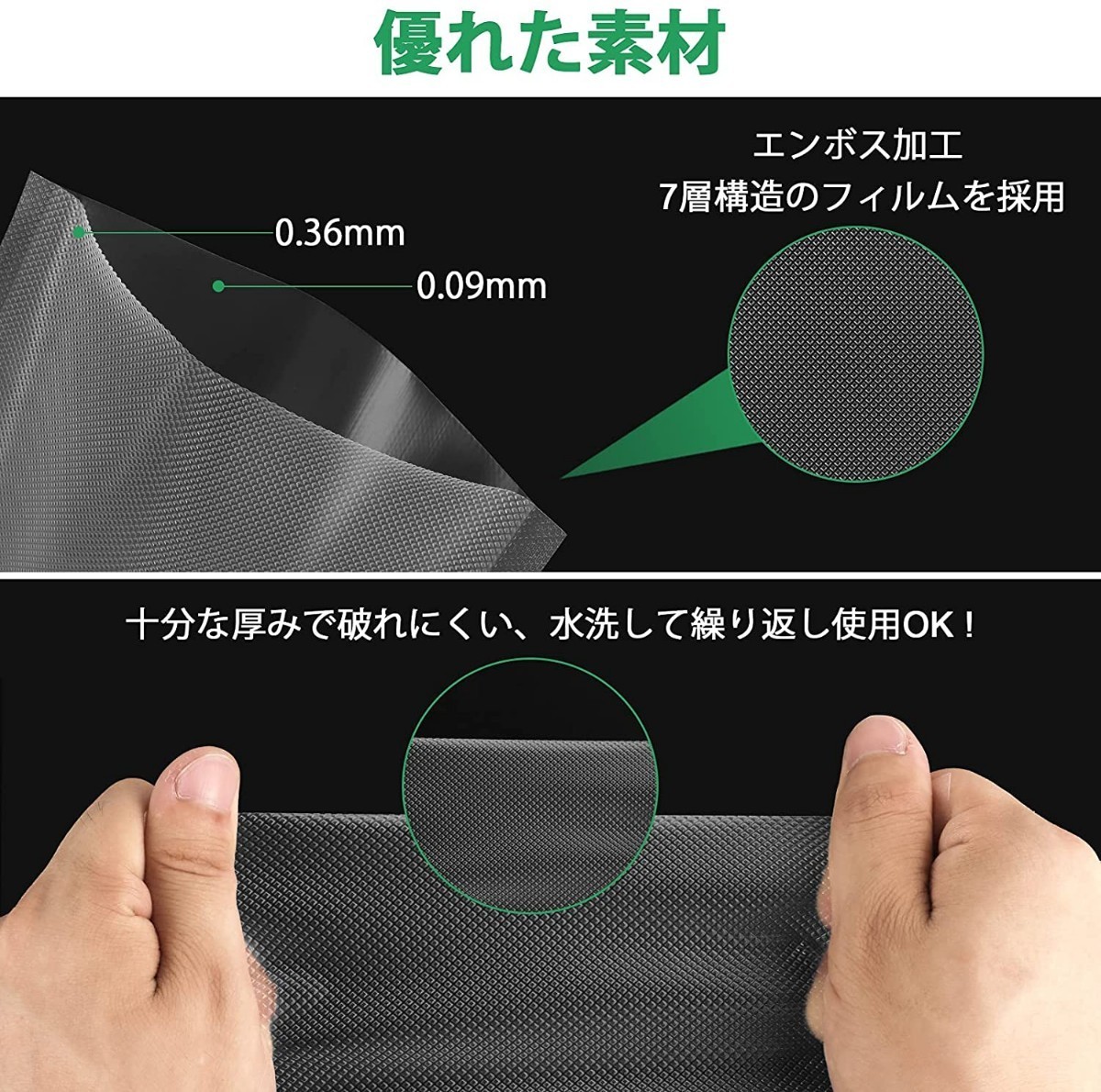 【安全で無毒な素材】 食品グレードのPA + PE素材は、環境に優しいし、非毒性で匂いもしなく、より安全で、安心して利用できます。簡単に開けるように設計された裂け口は、とても使いやすいです。片面は滑らかな透明、もう片面は空気の抜け易いエンボス加工がしてあり[吸引性能]を高めています。 全ての真空パック機で使用できます。