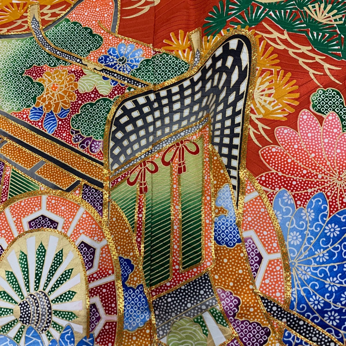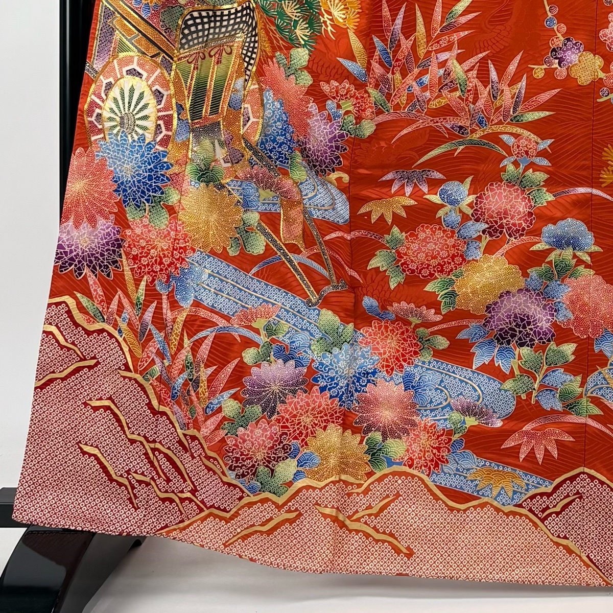 | 振袖 美品 秀品 御所車 草花 金糸 金彩 朱色 袷 身丈163 裄丈65 M 正絹 【中古】 |