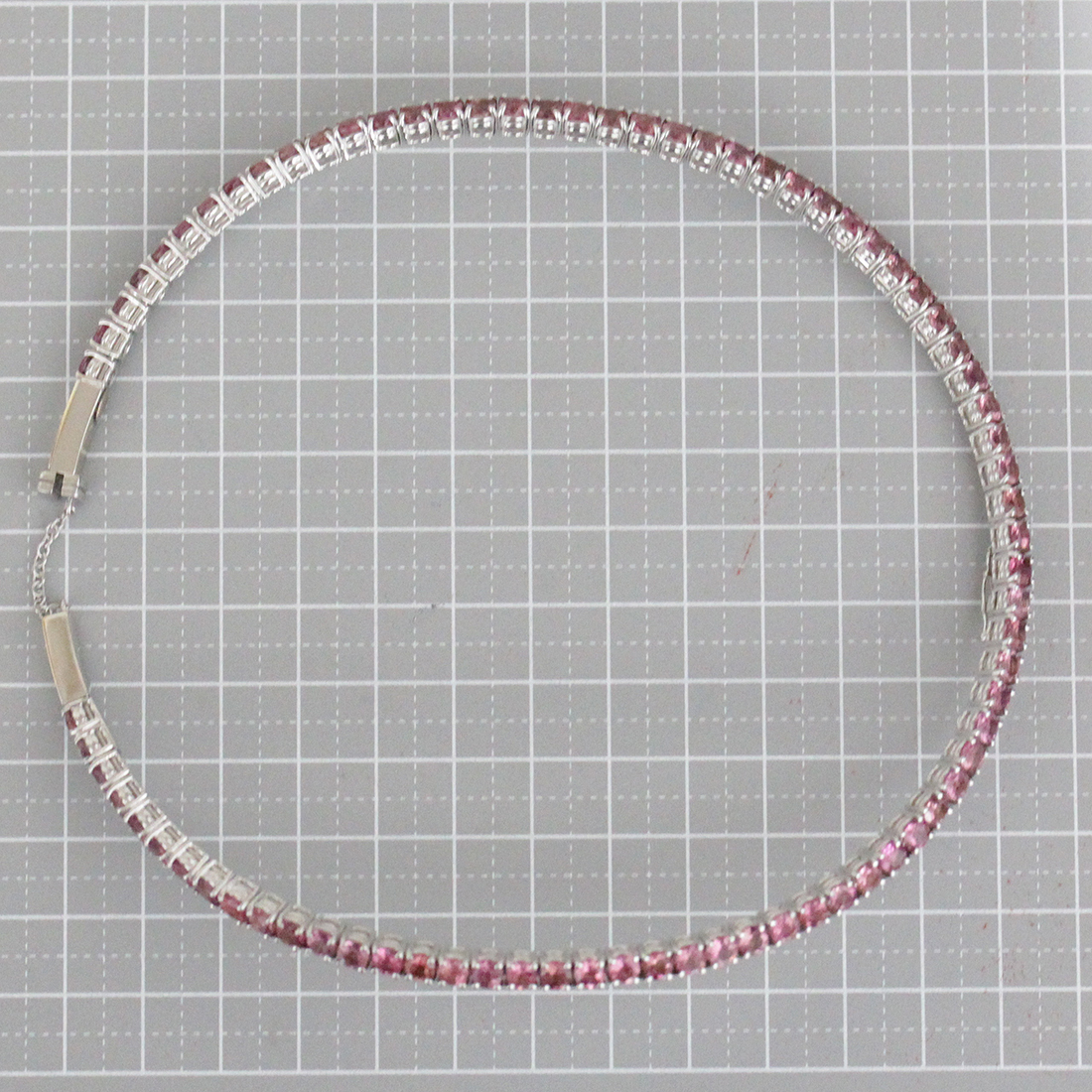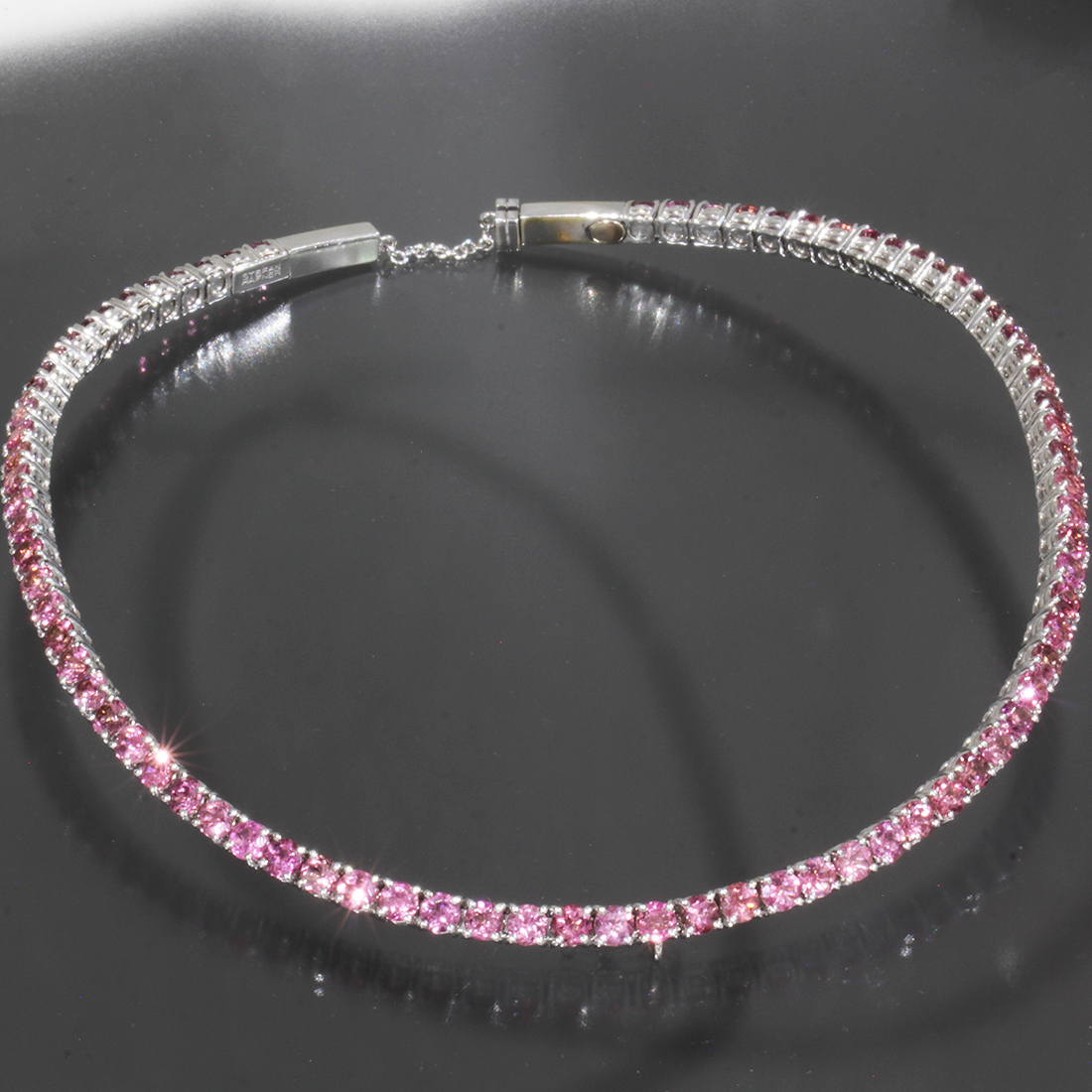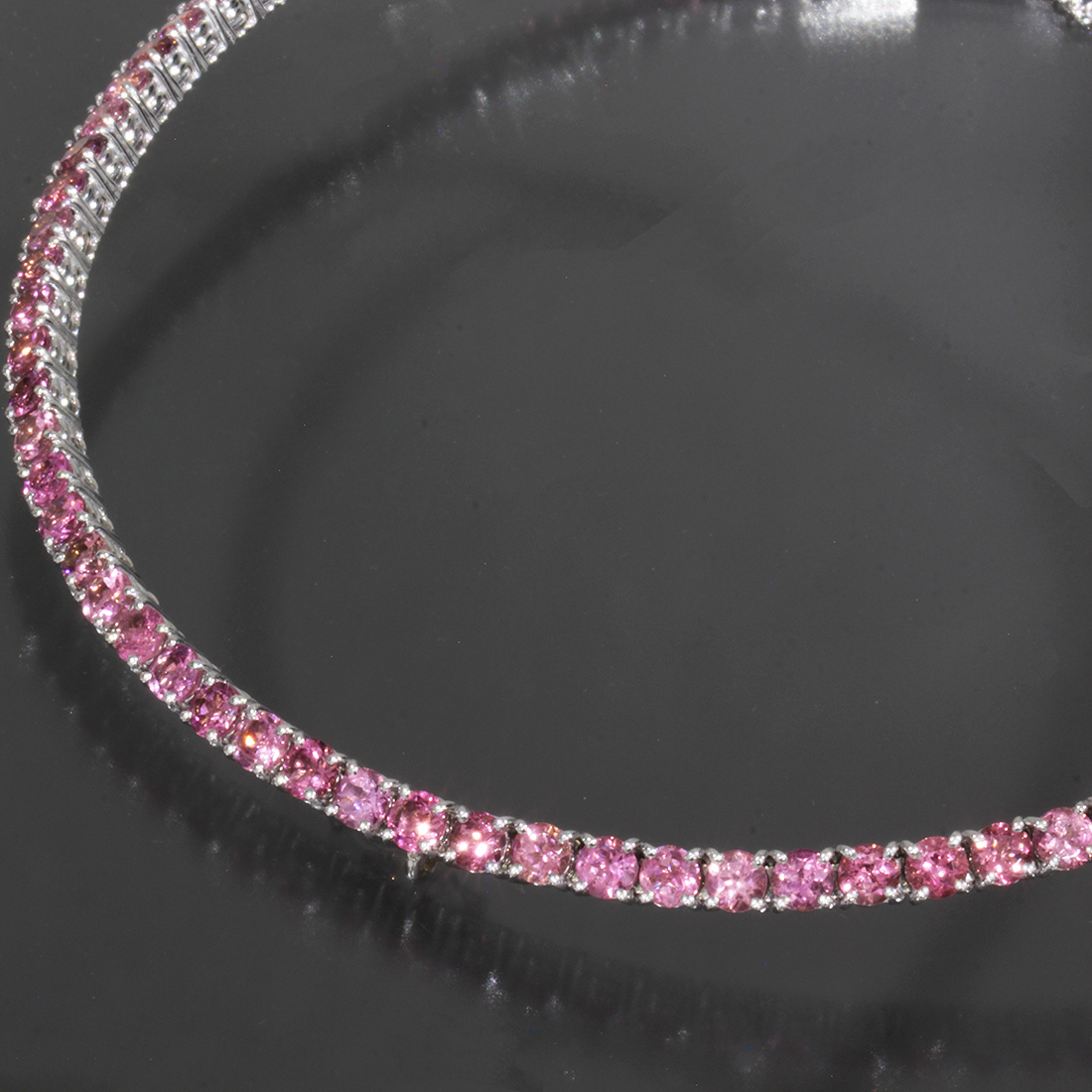 ■ ステファンハフナーのピンクのカラーストーンをぐるっと一周贅沢に使用したテニスネックレスです。画像のように正面部分にトップをかける部分とストッパーがございます。ホワイトゴールドとカラーストーンの美しい輝きが首元に彩りを与えます。ぜひご検討下さい。
