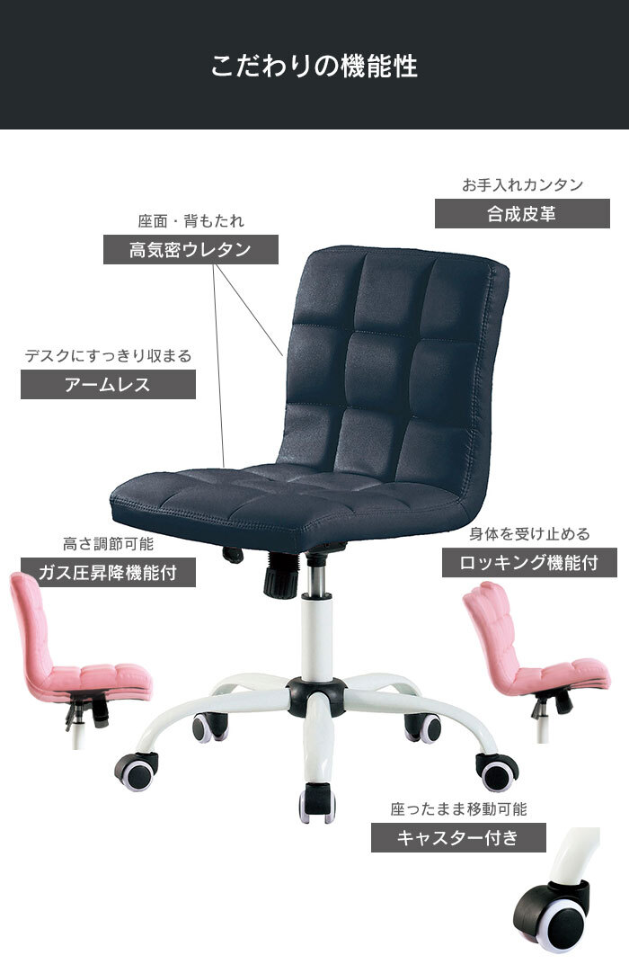 もこもこデザインと脚部のホワイトカラーがかわいいデスクチェア。 背もたれと座面には高密度ウレタンを使用しているので座り心地も抜群。 背もたれにゆったりと体をもたれかからせることができるロッキング機構付き。 張地は合成皮革を使用しているので、汚れてもさっと拭きとるだけでお手入れも簡単。 使う人の高さに合わせて座面の高さの調節が可能です。 キャスターはフローリングなど硬い床に適したPUキャスターを使用しています。 |