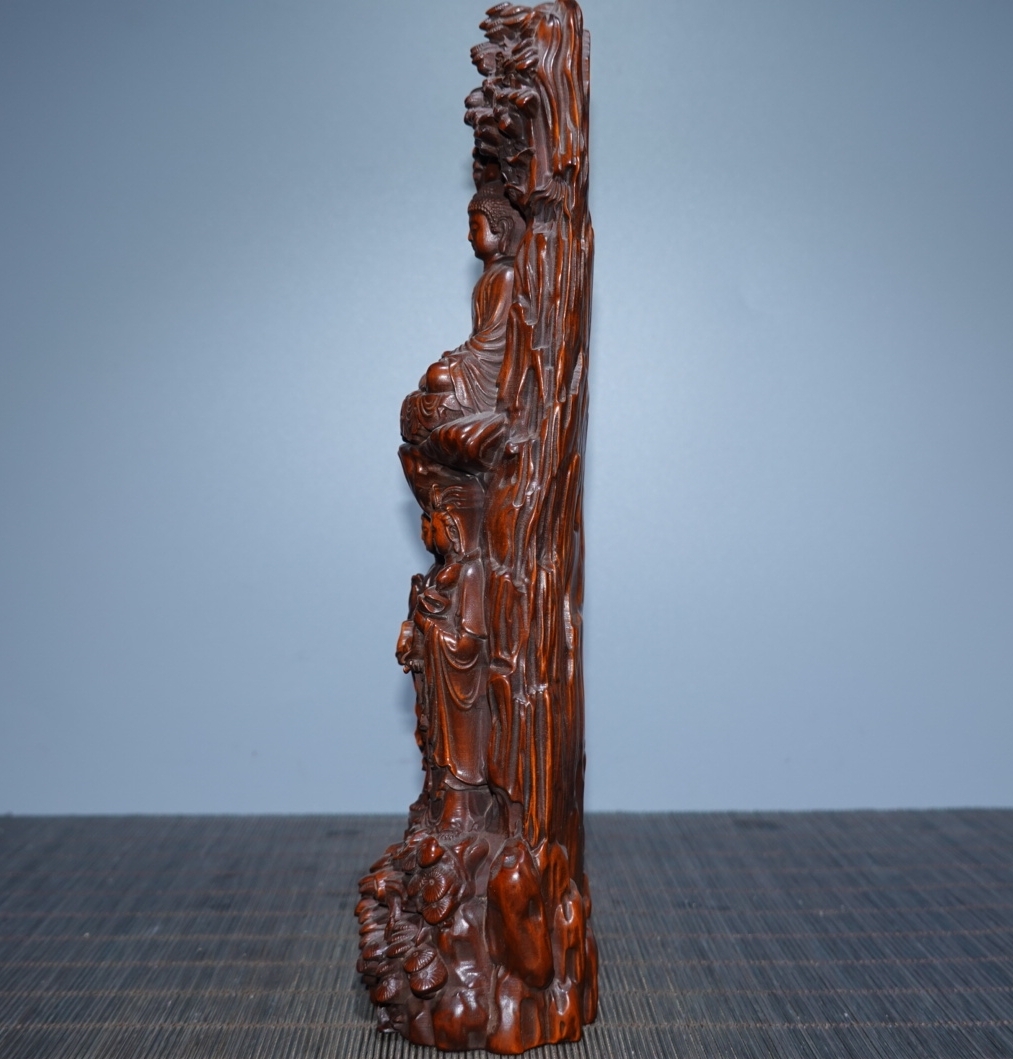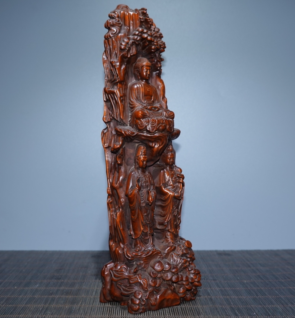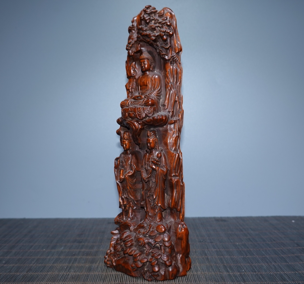 *珍品旧蔵* 清 木材細密彫 黄楊木 西方三聖の置物 木製 極細工 唐物 中国古玩 骨董品 古美味 H46