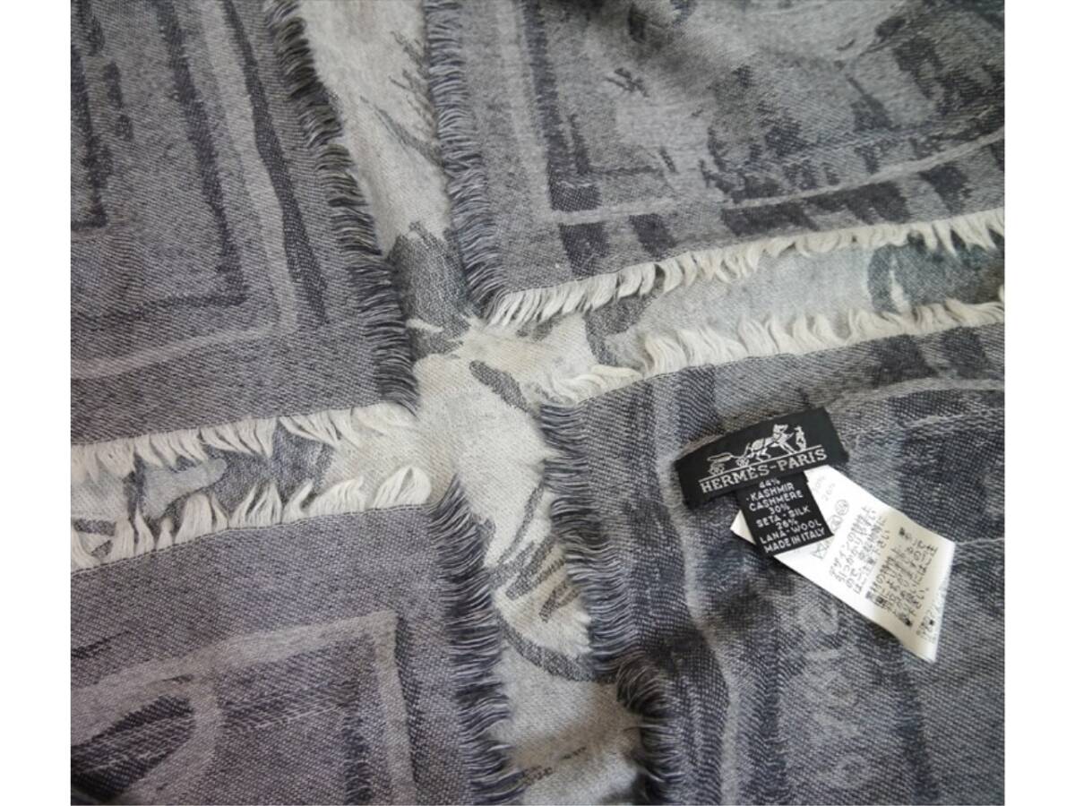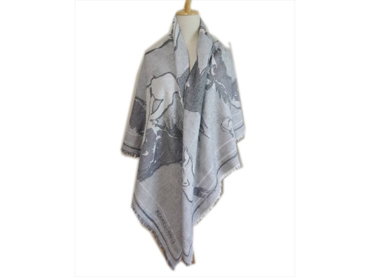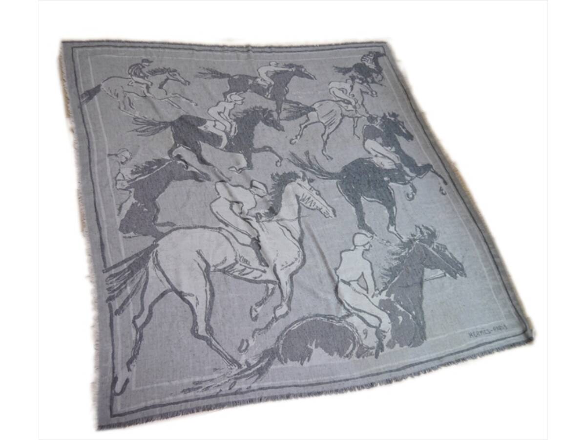 エルメス スカーフ ストール マフラー 馬 ホース フリンジ ブランケット グレー カシミヤ シルク ウール