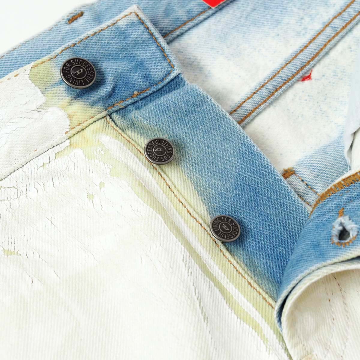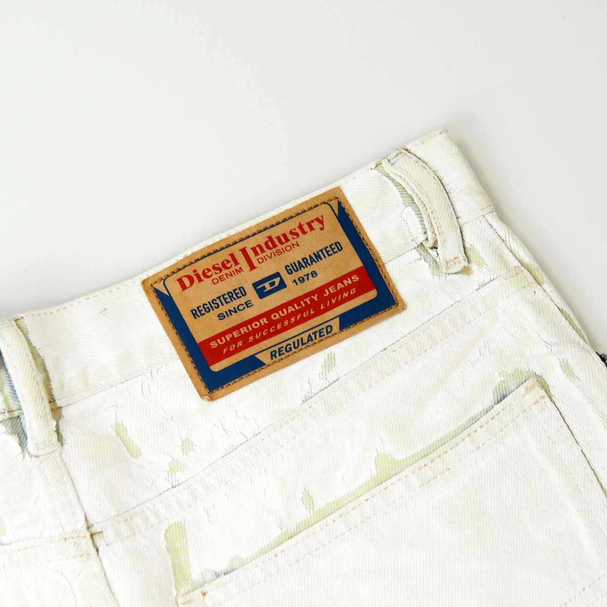 ホワイトを基調としたデニム生地には、全体にクラッキング加工が施され、ひび割れたペイントのような質感が唯一無二の存在感を放ちます。往年のムードと今の感性を融合させた、DIESELならではの一本です。