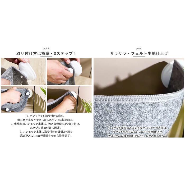 | 商品説明 | ・・大きな吸盤で窓ガラスにピタッ!眺めのいい場所でニャンとも快適「キャット用ハンモック」が新登場! ・【ネコちゃんのくつろぎスペース】 ・ひなたぼっこしながら、ゴロンとお昼寝♪半球型のポケットフォルムが見た目にも可愛い、窓ガラス取り付けタイプのユニークなネコちゃん用ハンモック。 ・【取り付け方は簡単・3ステップ!】 ・1.ハンモックを取り付ける窓を、湿らせた布なのであらかじめキレイに拭き取る。 ・2.半球型のハンモック本体に、大きな吸盤を3つ取り付け、丸ネジを締め付けて固定。 ・3.ハンモック本体に取り付けた吸盤3ヶ所を窓ガラスにしっかり密着させたら設置完了! ・【サラサラ・フェルト生地仕上げ】 ・しっかりと厚みのある丈夫なハンモックの表面は、サラリと肌触りのよいフェルト生地仕上げ。ネコちゃんの被毛が付きにくく、お手入れも楽ちん。 ・【強力吸盤で窓ガラスにピタッ】 ・直径約8.5cmの大きな吸盤で、窓ガラスの表面にピタッと吸着。ネコちゃんがお昼寝している間に簡単には?がれない強力吸盤を採用。(※通常の使用では外れませんが、ネコちゃんの体重や力の掛かり方により稀に外れてしまう場合がございます。落下しないことを保証するものではございません。) ・【ネコちゃんの背中にフィット】 ・ハンモック内側の滑らかなアーチ形状が、寝転んだネコちゃんの丸い背中にフィット!すっぽりとはまったら、気持ちがよくてもう動けニャイ♪ ・【あったかボアマットが付属】 ・冬の小春日和の日射しの中でもくつろげる♪窓辺でもほっこり暖かなボアマットが付属。ハンモックの内側にぴったり収まる半月形状がポイント。 ・【肉球マークがチャームポイント】 ・ハンモック側面を繰りぬくように配置された肉球マークがデザインのワンポイント。丸いすき間から覗く、ぶにっと膨らんだ背中の毛がとってもキュート。 |