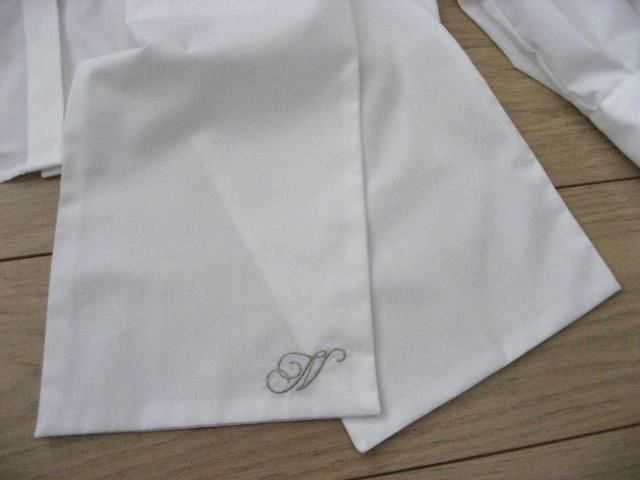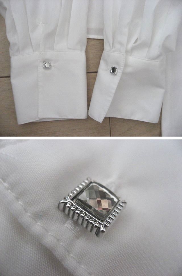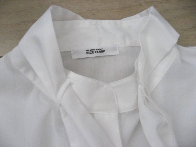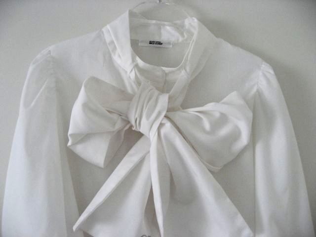 サイズFで、実寸では、 (約、平置き) 肩幅 :33㎝ 袖丈 :64㎝ 身幅 :47㎝ 着丈 :55㎝ 素材 :綿80%、ポリエステル20% 色 :白 製造元 :㈱ナイスクラップ ほとんど着用してないのでキレイですが、少しシワがあります。 ボウタイは取り外し可能です。長さ88㎝のが2本で、中央にスナップボタンがあり襟の後ろでボウタイの端と端を止めるようになっています。全体の重さ約240gです。 |