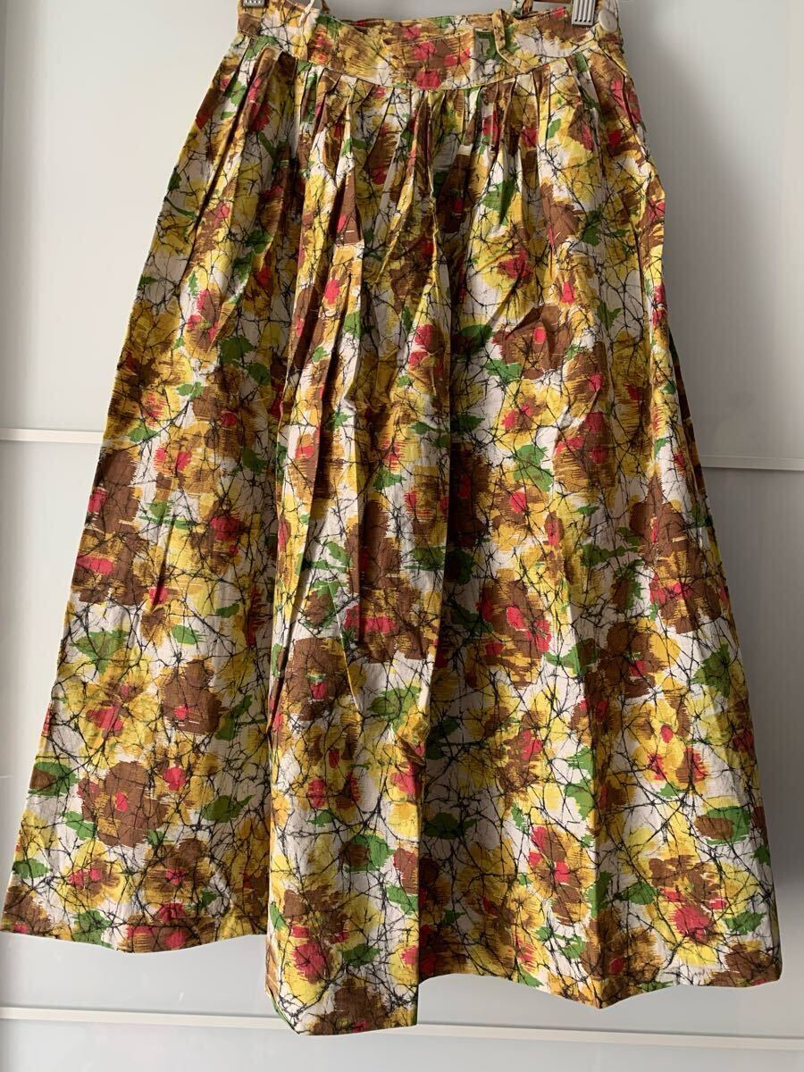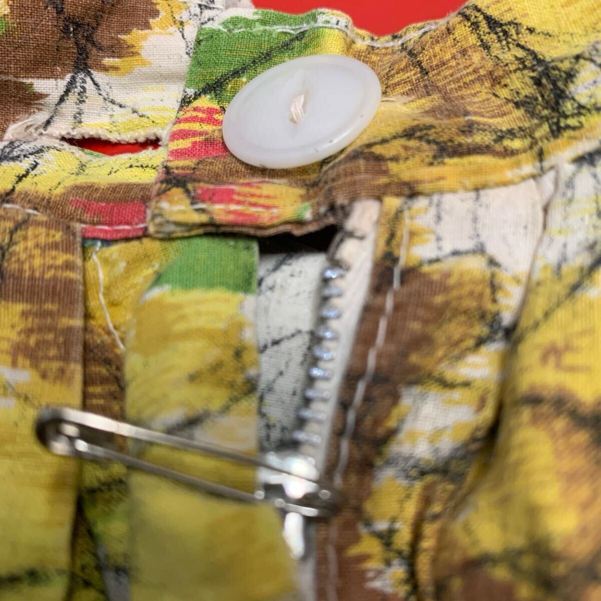 ブランドタグはついていません。ウエストは猫目ボタンとコの字のジッパーです(写真2)。ジッパーのヘッドが無く、安全ピンで代用しています。