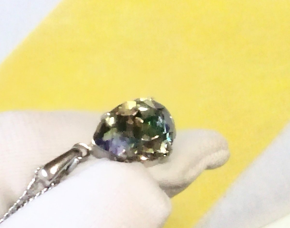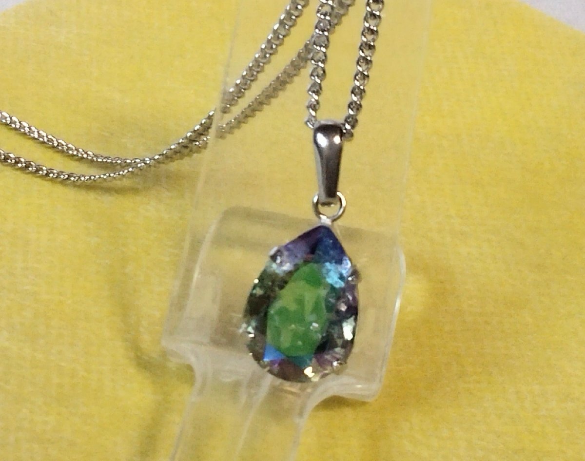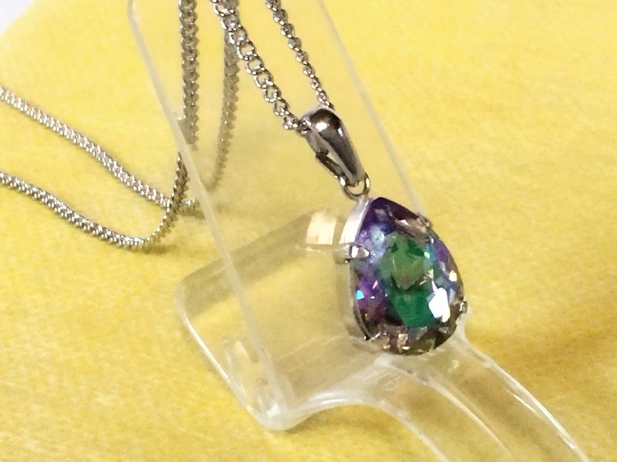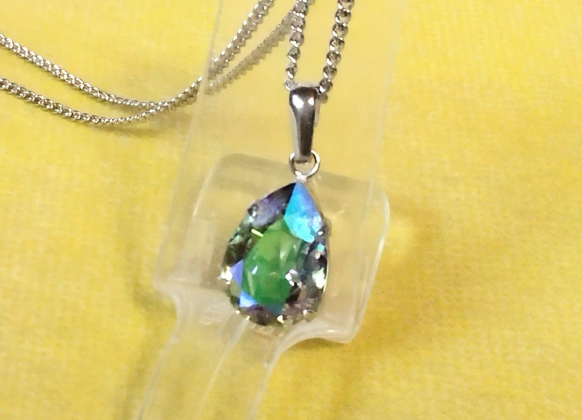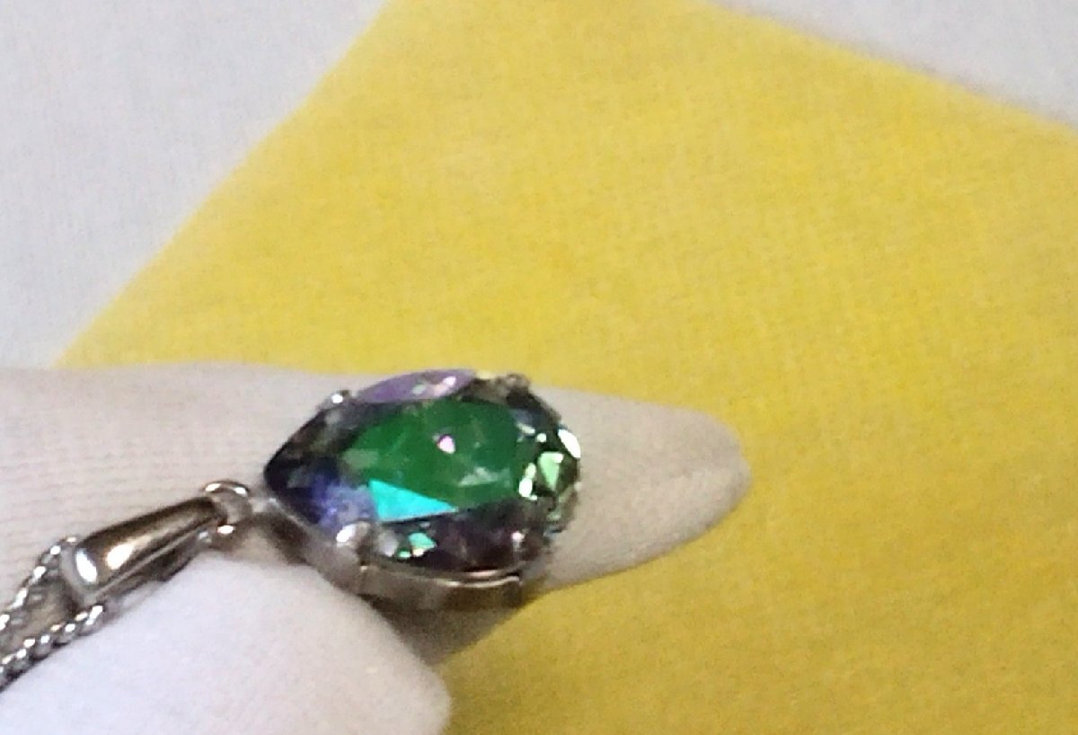 サイズ | サイズ:★トップの大きさは、15×10ミリです。 ★ CRYパラダイスシャインスワロフスキー 1石の大きさは、14×10ミリです。 ★ チェーンは、ロジウムメッキの 喜平チェーン45cmです。 |