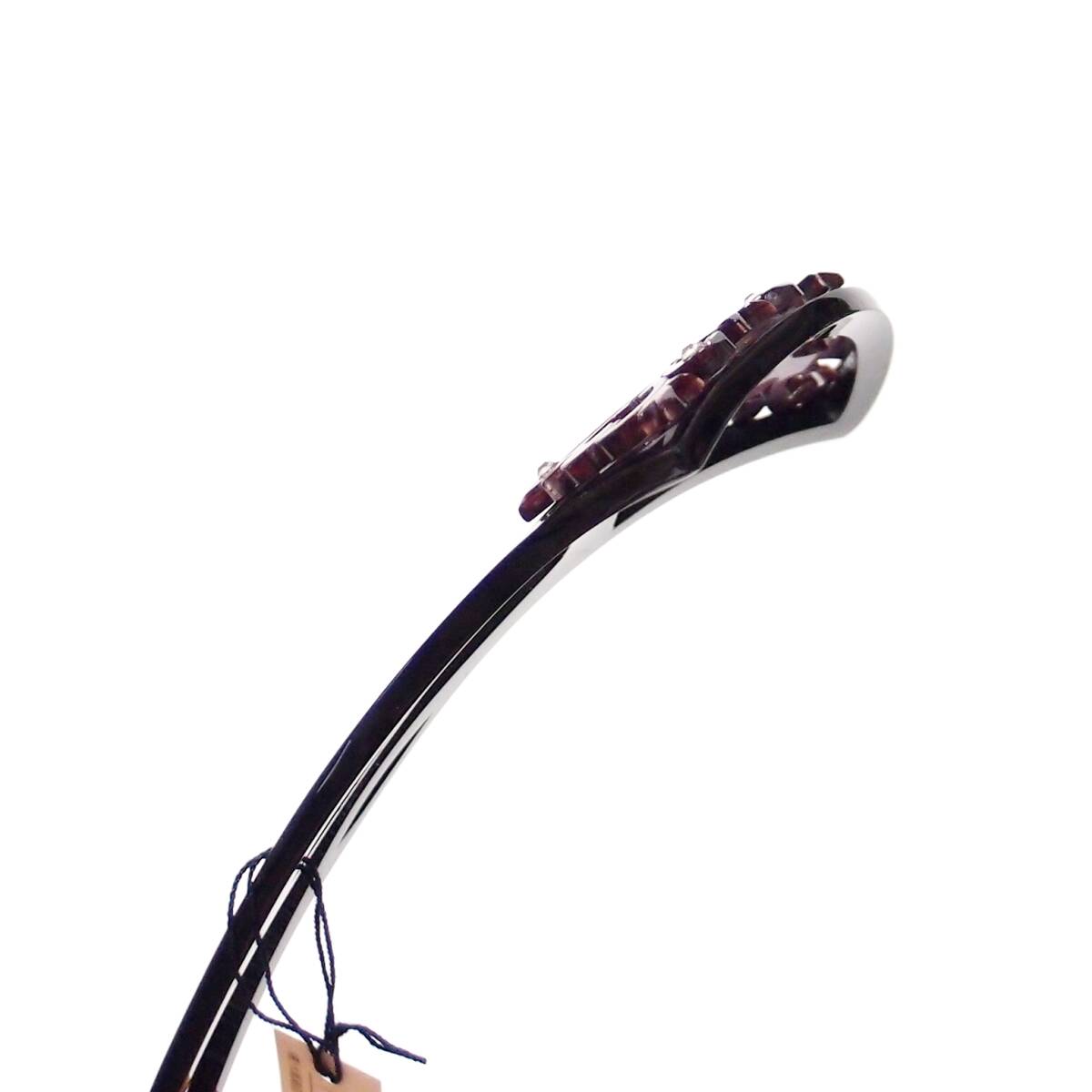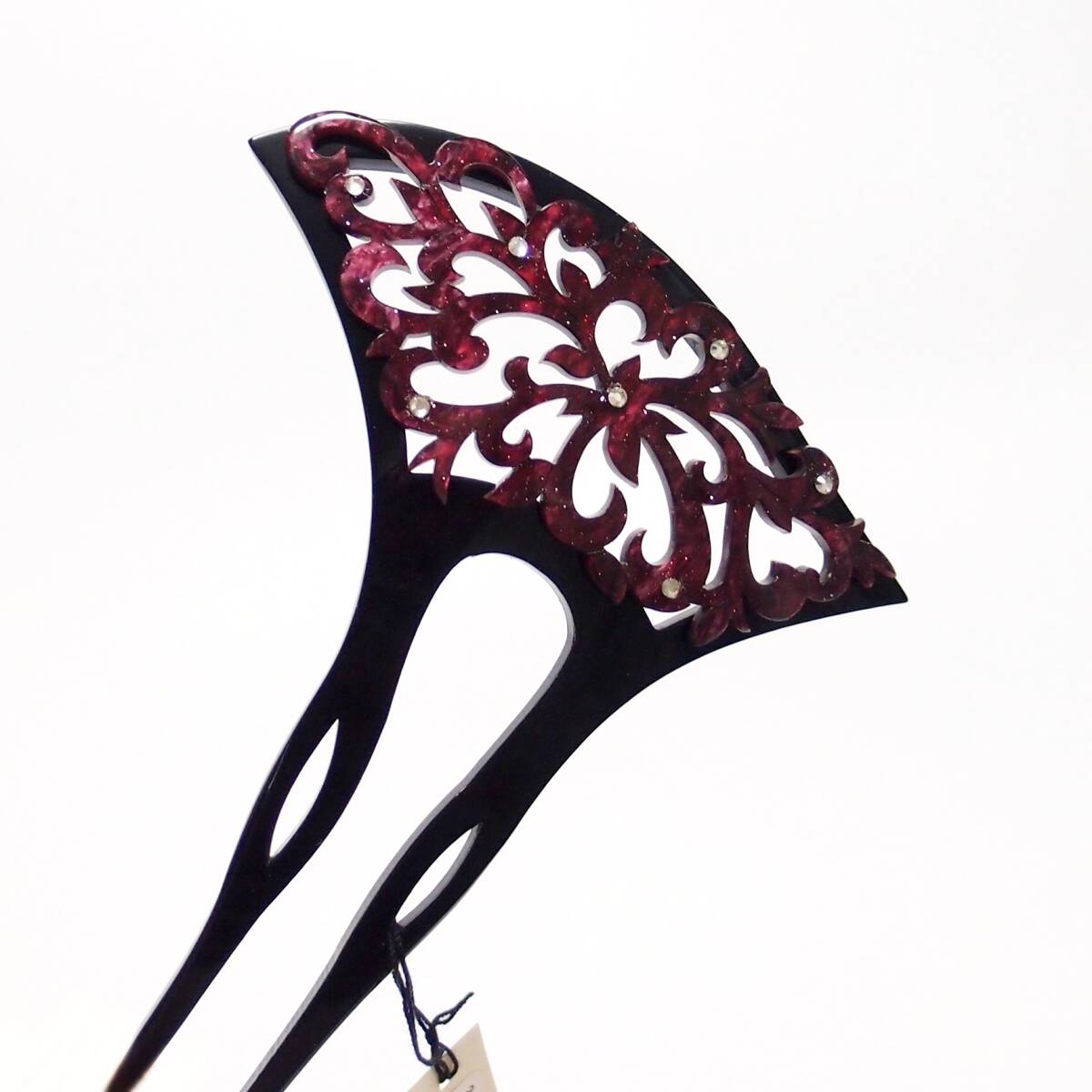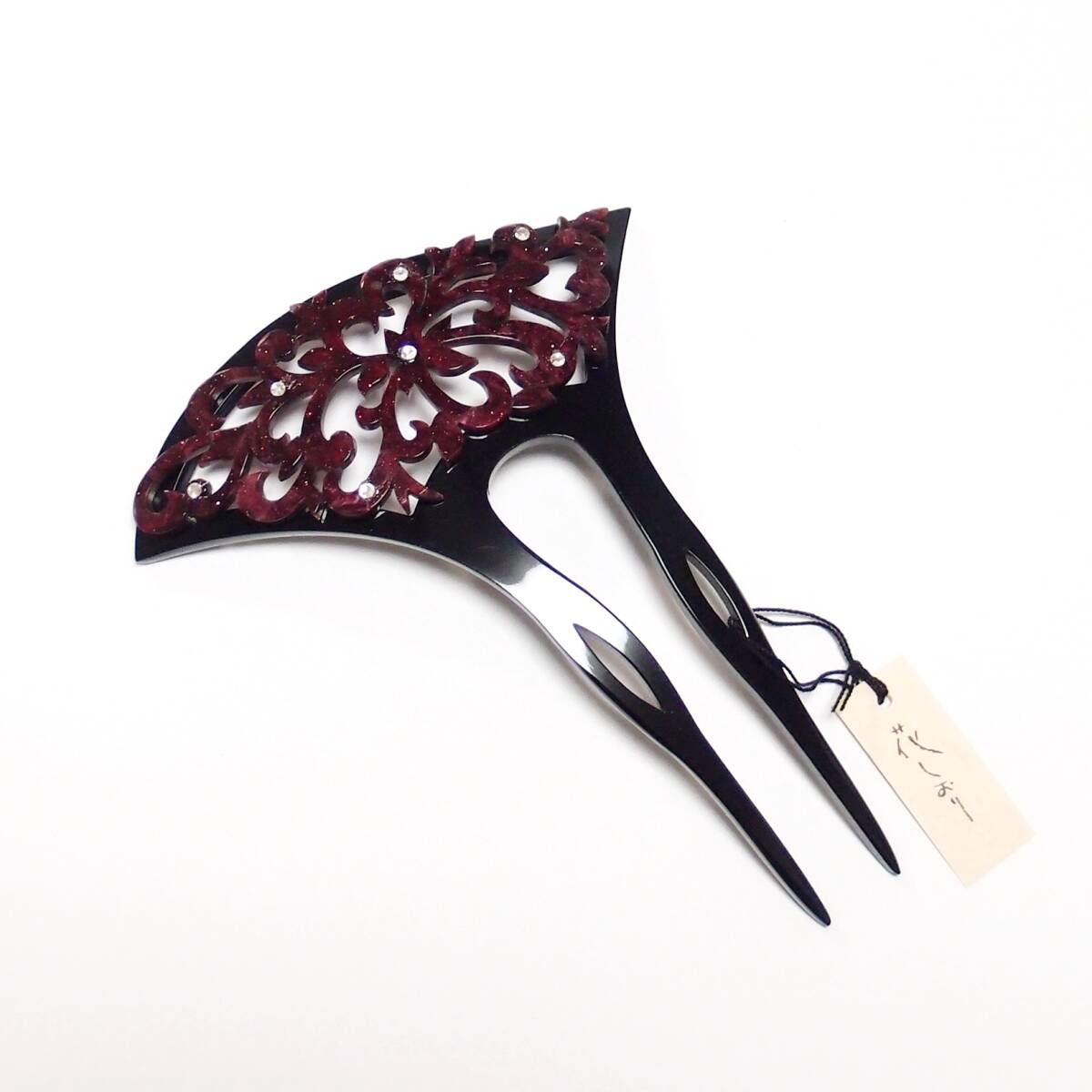 長さ 約14.3cm 希望小売価格 4950 大振りなばち型簪です 黒の土台に、落ち着いた赤紫の濃淡に、控えめにラメが配された飾り部分です ポイントにラインストーンもあしらわれています 他のお色に比べ、落ち着いた発色で、大人の華やかさのある一本です |
