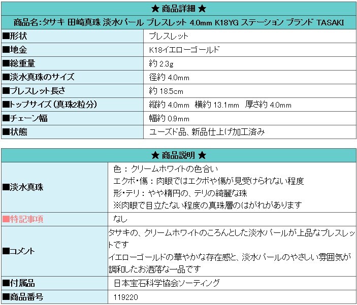 | 商品名:タサキ 田崎真珠 淡水パール ブレスレット 4.0mm K18YG ステーション ブランド TASAKI | |