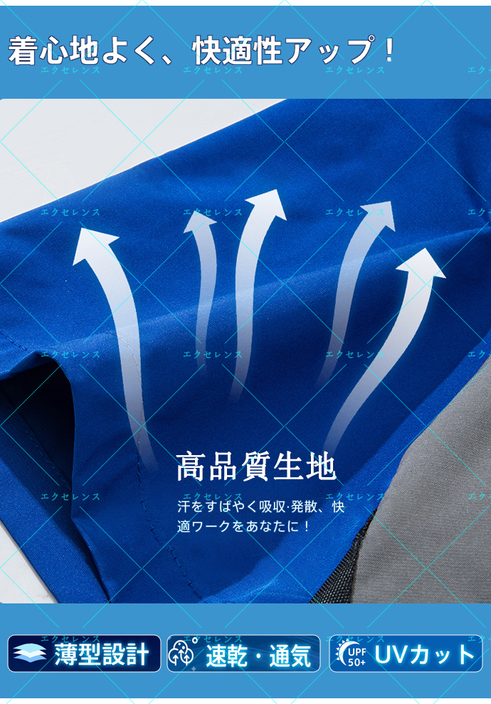 ★【通気性抜群】生地の微細孔は通気性があり、左右の腰の辺りに取り付けられたファンを用い、衣服の中に外気を取り入れ、体の表面に大量の風を流すことにより汗を蒸発させ、体を瞬時に冷やし、全身を清涼感で包みます。炎天下の作業で涼しい服の使用範囲は非常に広く、高温の悪境、建築労働者、室内作業、屋外作業及び屋外探検など多くの場面で使用でき、暑さ対策と夏場の作業効率を上げられます。