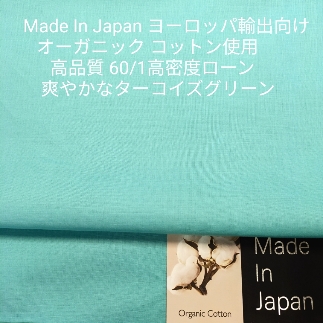 ピュアなオーガニックコットンの60/1で国内の播州地区でヨーロッパ向け輸出用で織られた高品質な高密度系ローン生地です。 オーガニックコットンのソフトでふっくらと優しい肌触りの風合いに仕上がってます。 通常のローン生地より高密度で透け感も抑えられていて、これからのホームソーイングでシーズンレス巾広く使える生地です。 お色は、爽やかで涼し気なターコイズグリーンです。 サイズ 135cm×2m 混率 綿(オーガニックコットン)100%