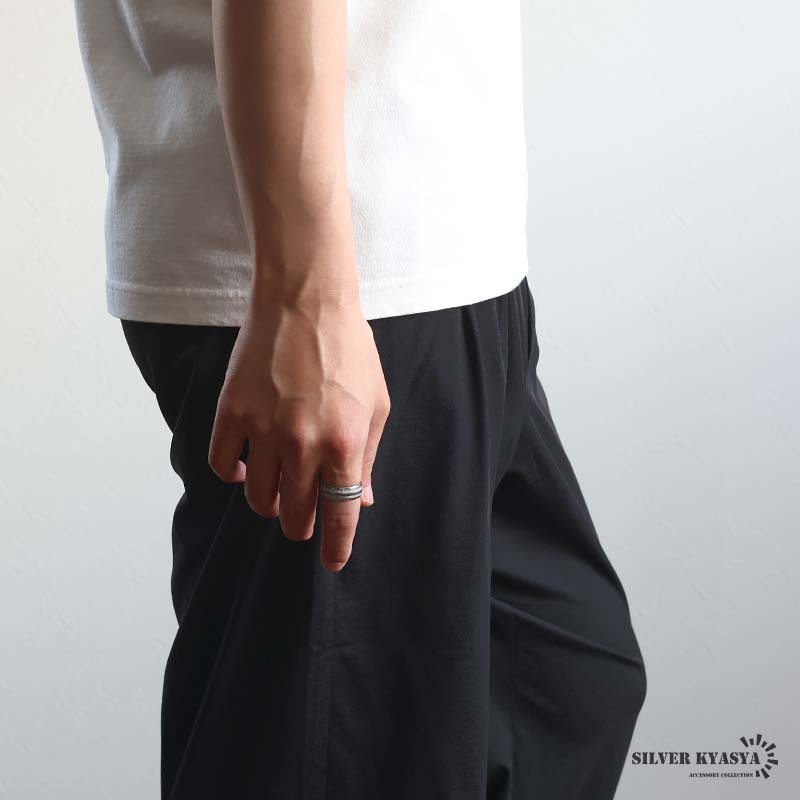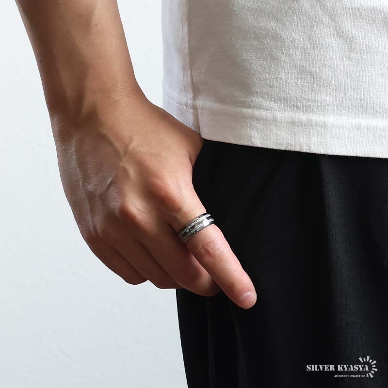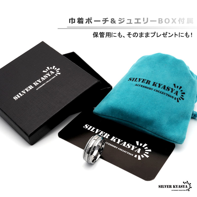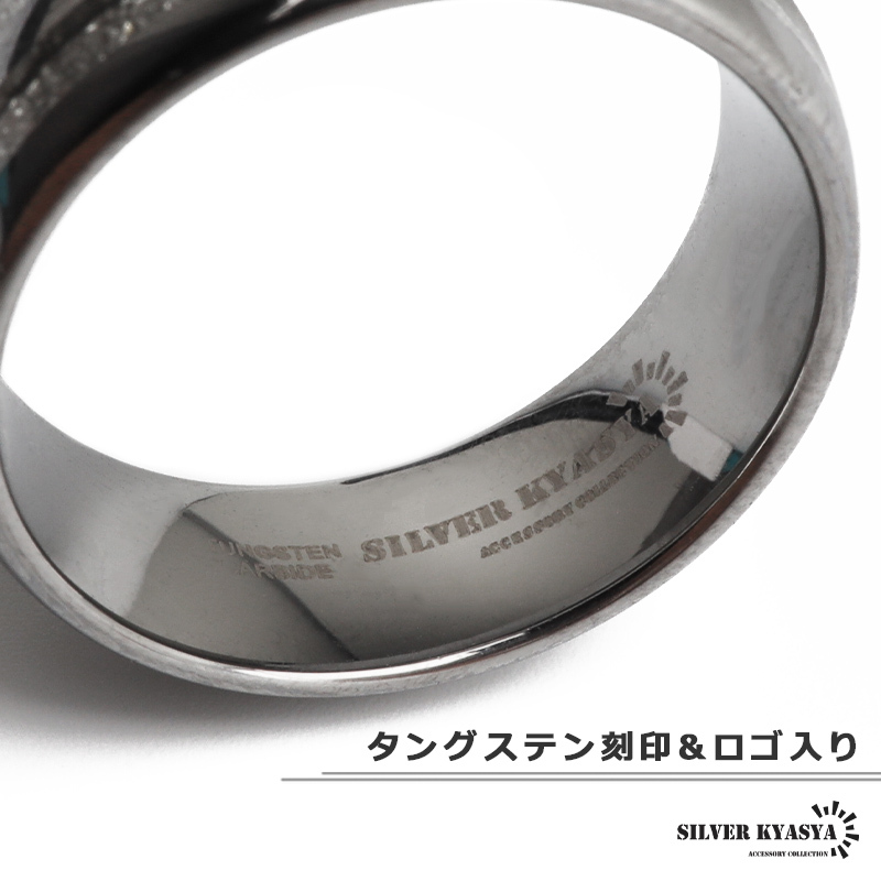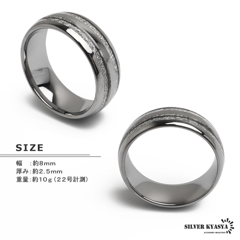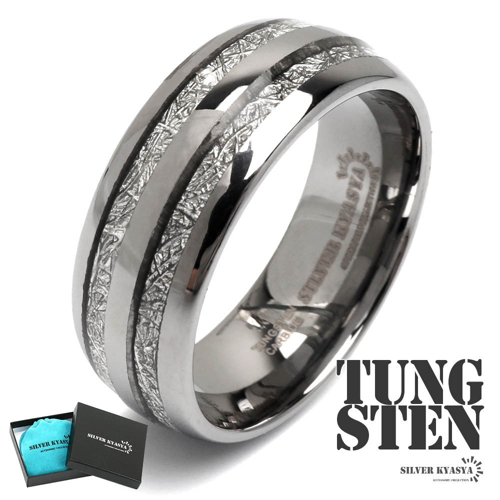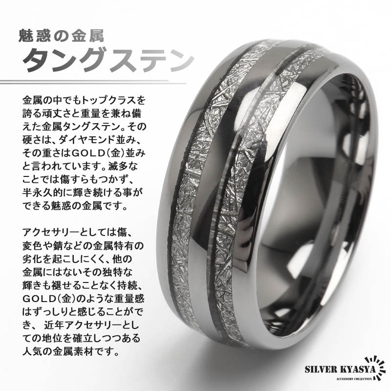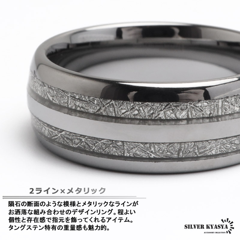 隕石の断面のような模様とメタリックなラインがお洒落な組み合わせのデザインリング。程よい個性と存在感で指元を飾ってくれるアイテム。タングステン特有の重量感も魅力的。