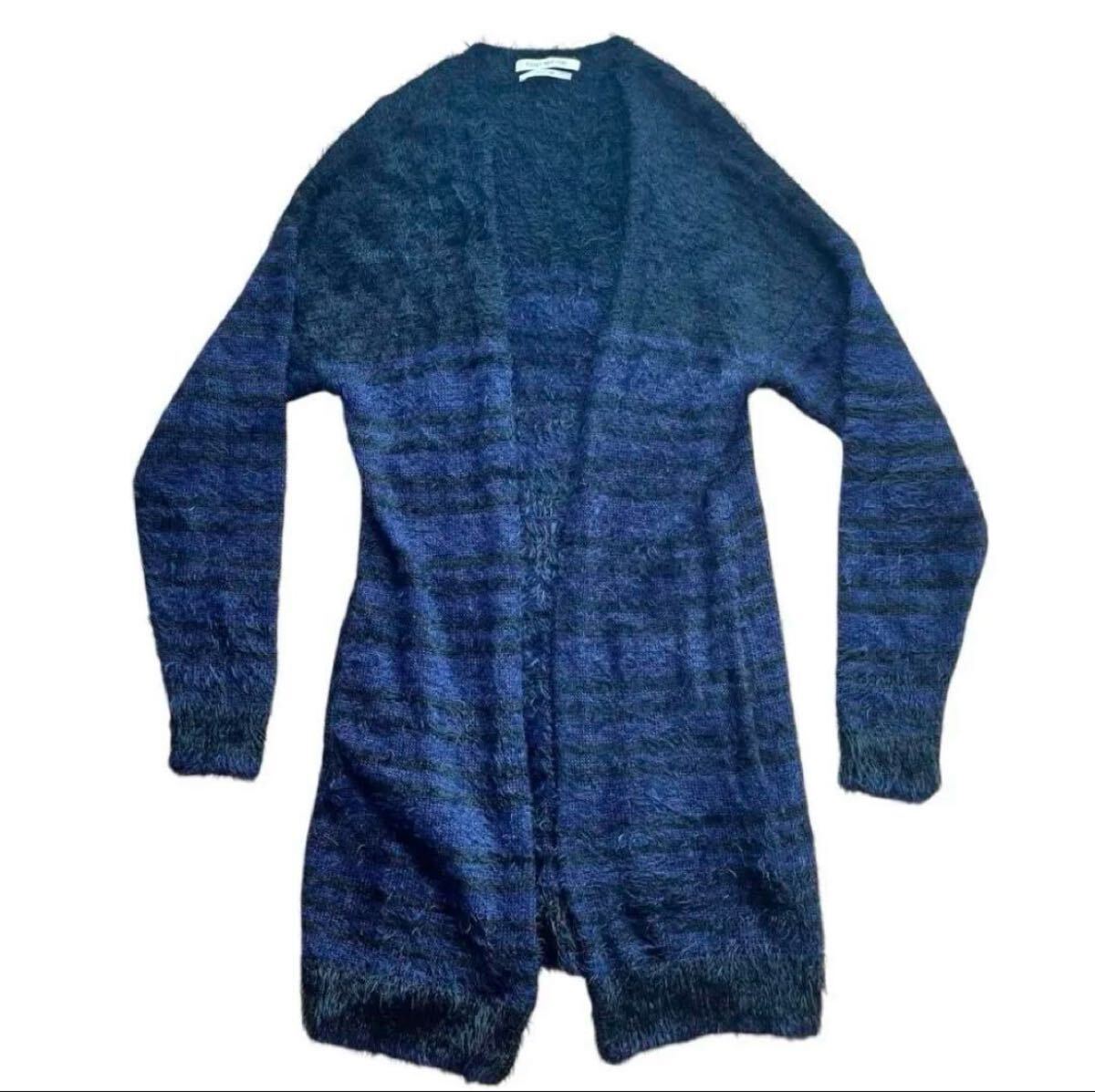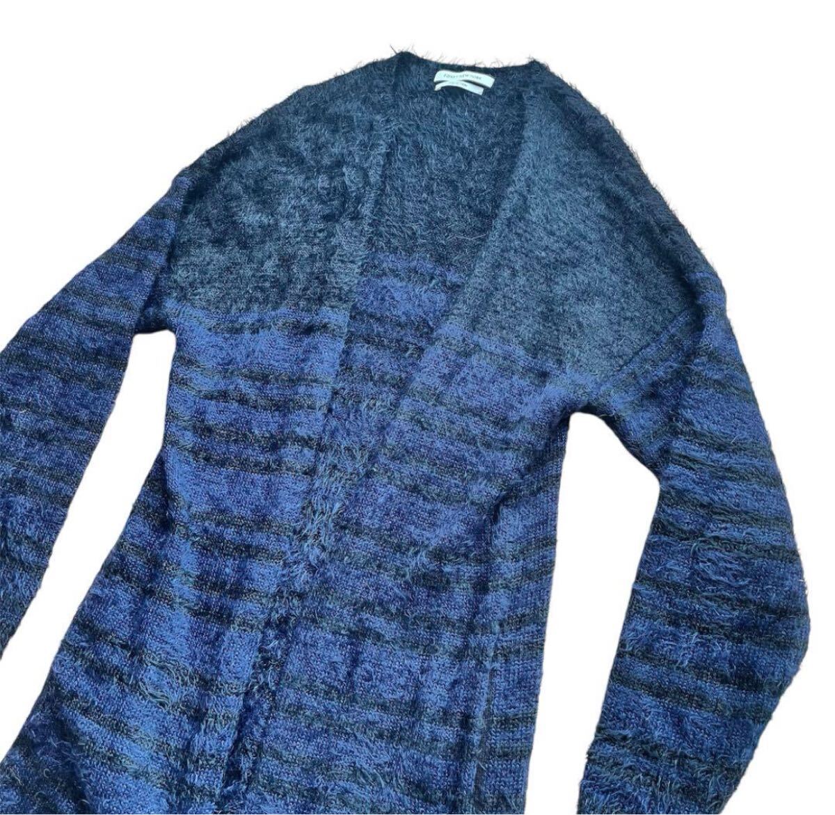 フワフワしたニット素材のダークブルーとグレーのストライプのオープンフロントカーディガン。