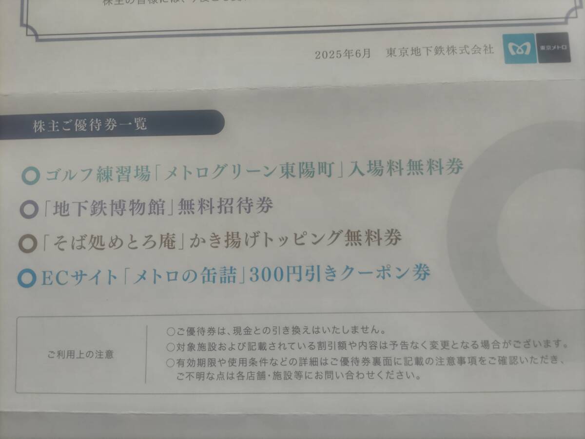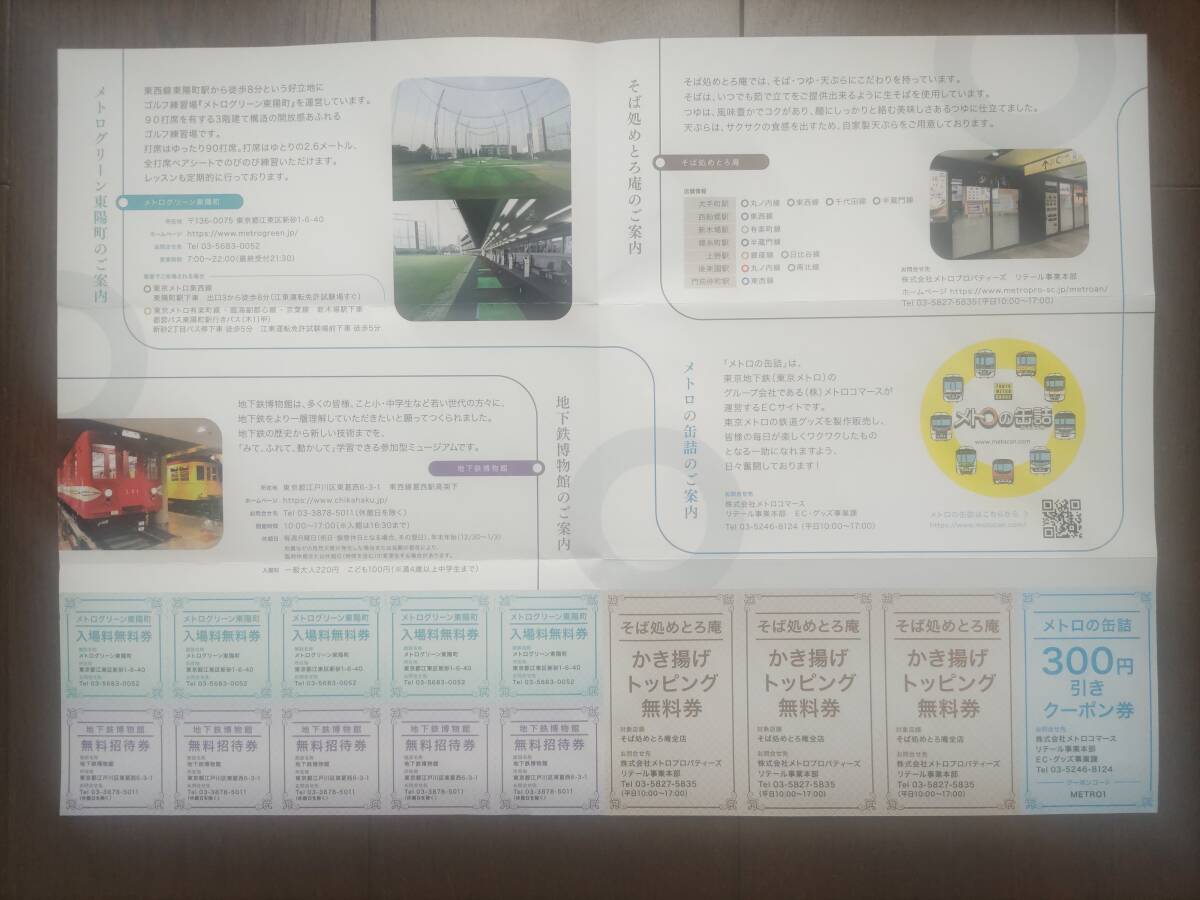 15 ★東京メトロ★株主優待★かき揚げトッピング無料券3枚★地下鉄博物館・メトログリーン東陽町無料券各5枚★有効期間:2026年6月30日