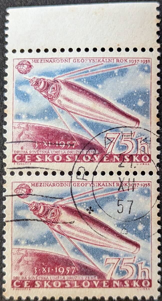 【外国切手】 チェコスロバキア 1957年12月20日 発行 国際地球観測年 - 地球儀を示し、1957年から1958年の日付を記入 2連刷 消印付き