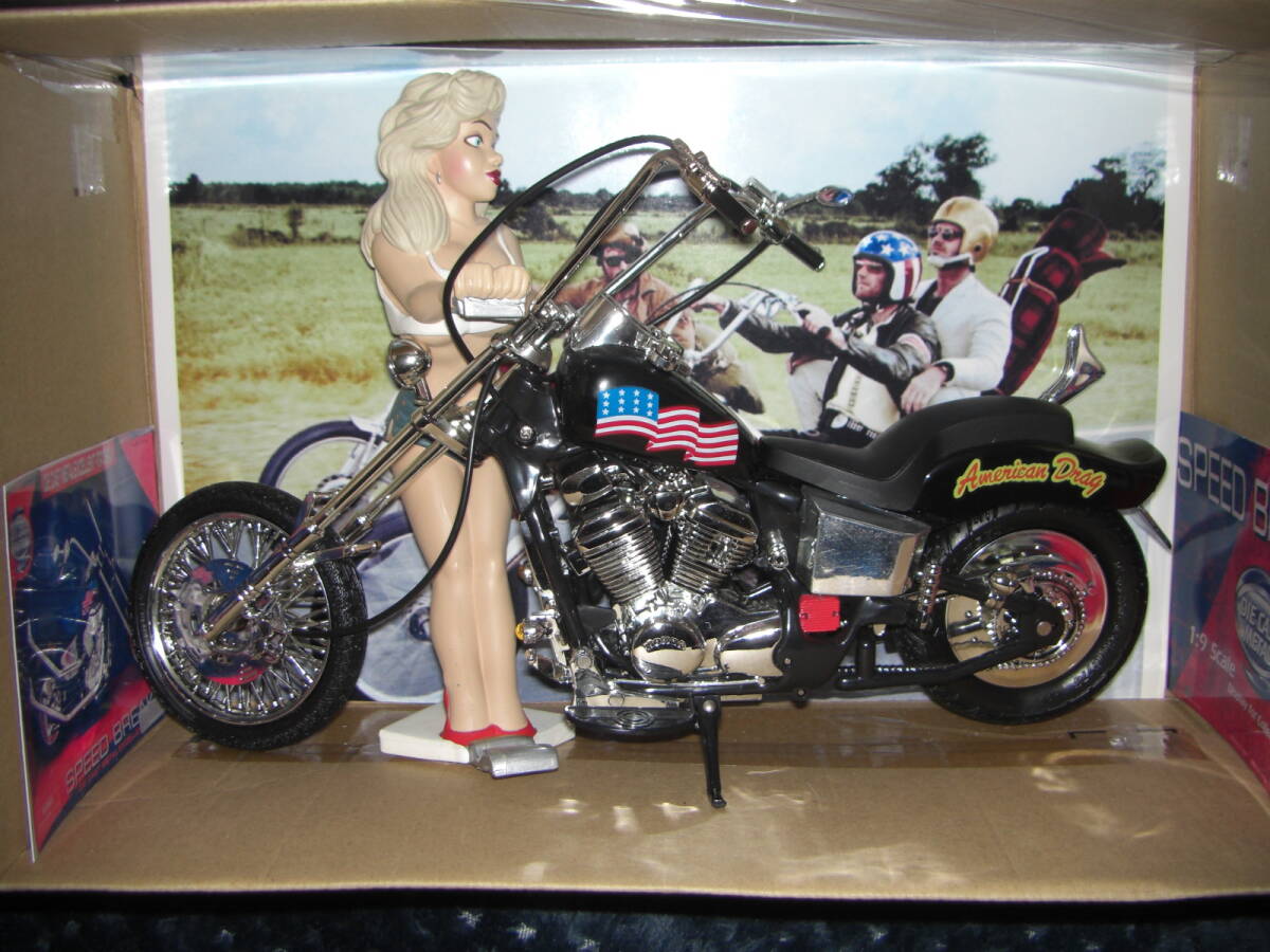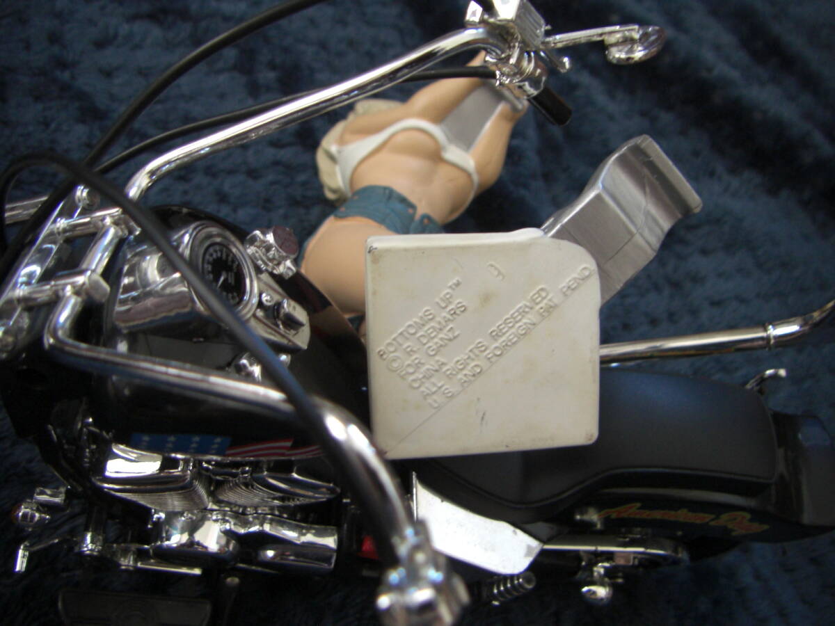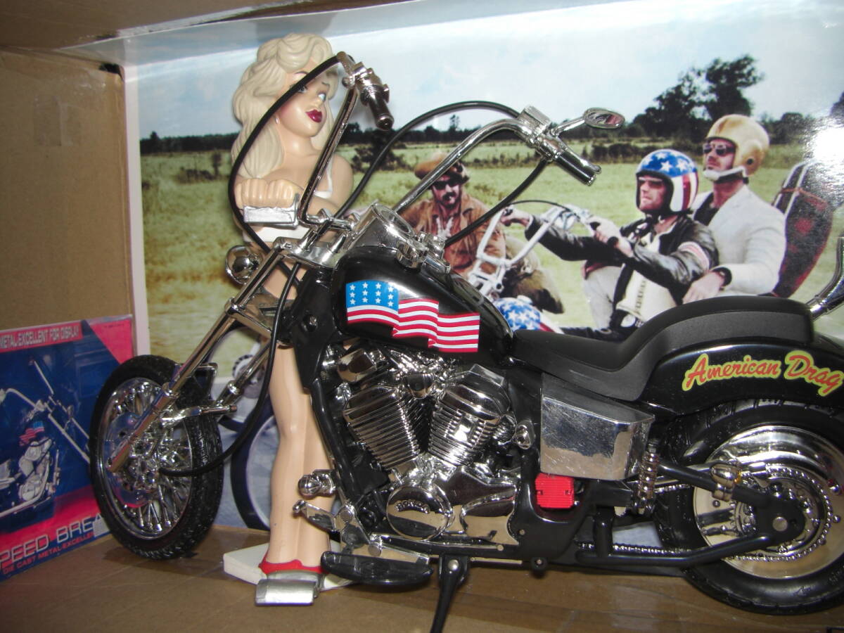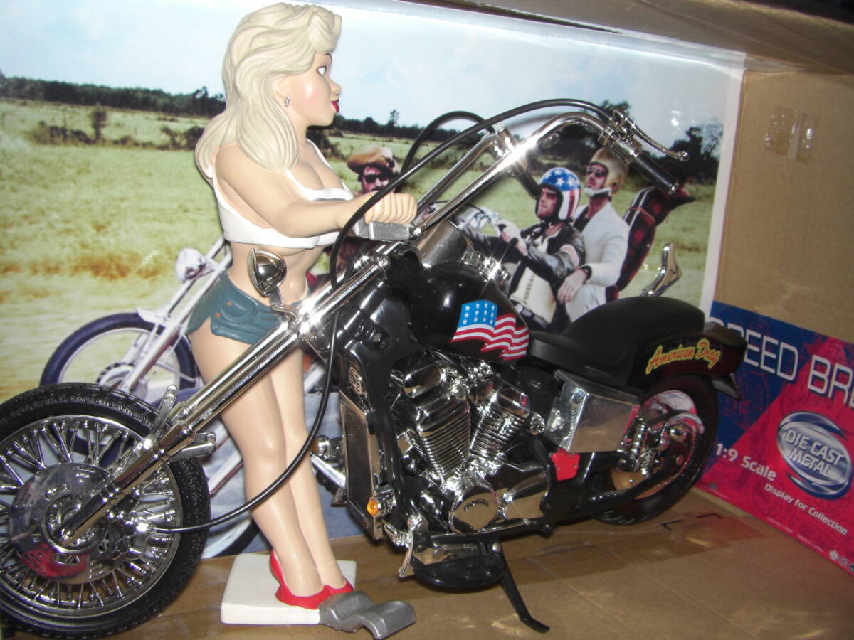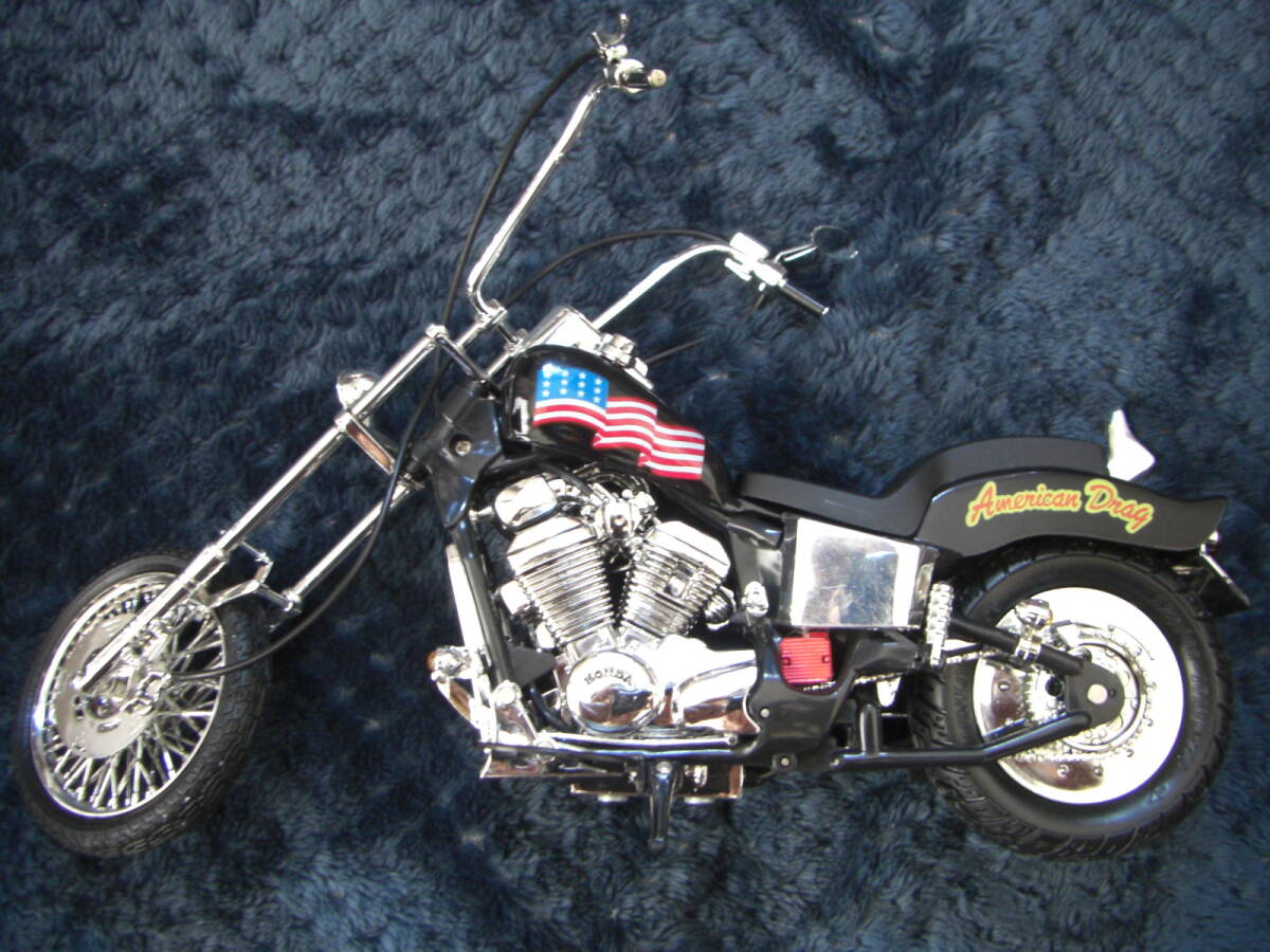 1/9スケール ダイキャストモデルのホンダ スティード アメリカンドラッグ チョッパーにディスプレイ用に女性フィギュア(ドリンク缶ホルダ)を加えて自作BOXに収めたものです。