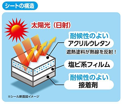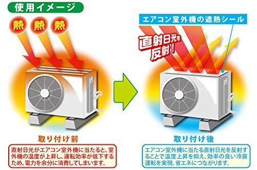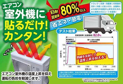 ブランド:ワイズカラー:マルチサイズ:約20×33cm(1枚あたり)太陽熱による温度上昇を抑える!「エアコン室外機の遮熱シール」○直射日光を反射し太陽熱によるエアコン室外機の温度上昇を抑え冷房運転中の室外機の負担を軽くします。○室外機にかかるホコリや汚れを防ぎ天面を保護します。○取り付けが簡単なシールタイプです。○大手塗料メーカーが開発した遮熱塗料(上塗り層)を使用し塗料内部の特殊反射粒子が効率良く太陽光を反射します。商品サイズ:W20xH33cm(4枚入)上塗り層:アクリルウレタンフィルム:塩化ビニル樹脂接着剤:アクリル耐熱温度:80℃商品サイズ:W20xH33cm(4枚入)