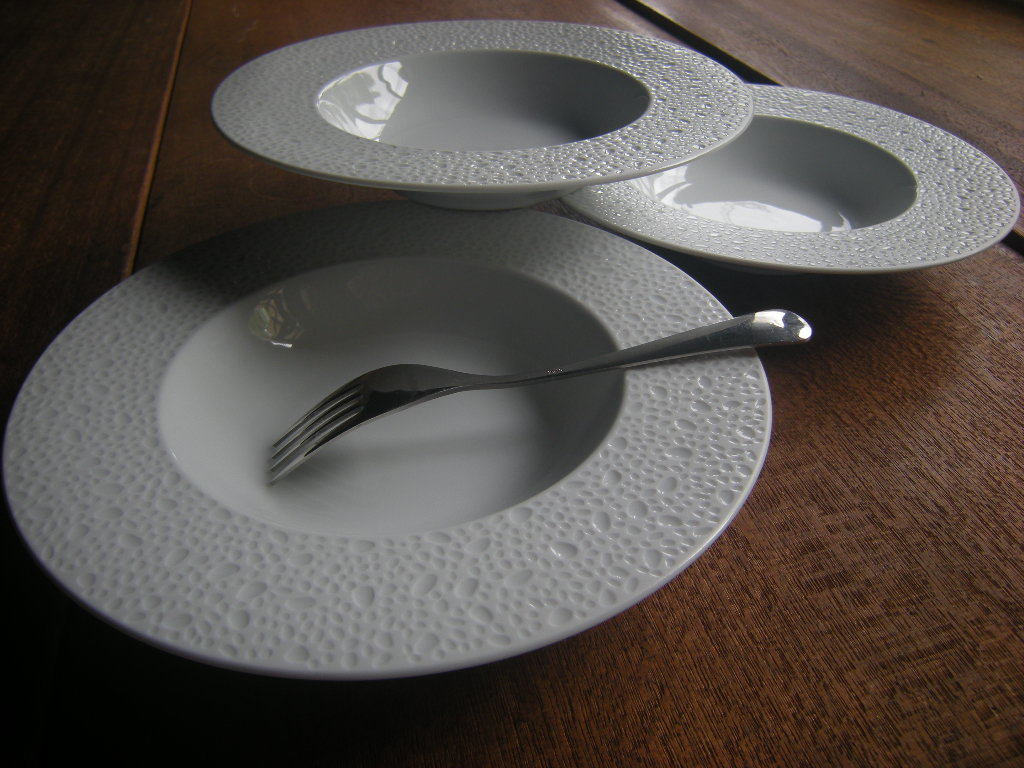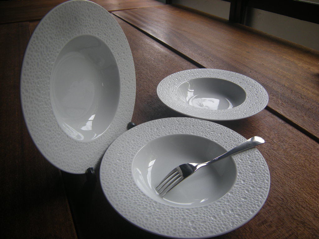 山◎美濃焼【新品・未使用】エンボス 象嵌 小石 白磁器 スープ・パスタ プレート 9in(24㎝x4㎝)1枚 *新作*高級ホテルうつわ*