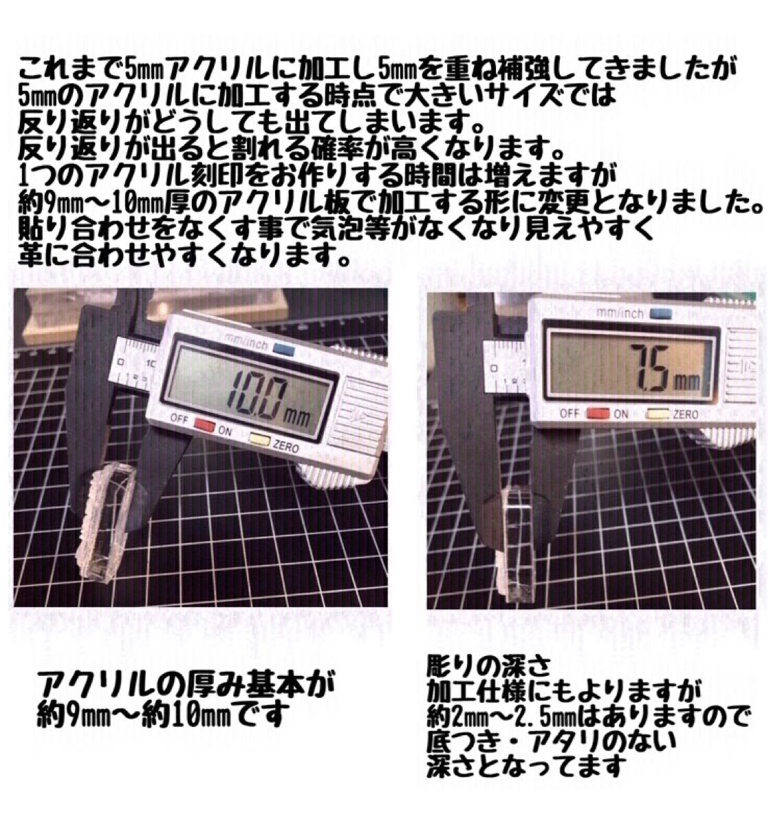これまで同様、にゃがクラフト工房様より教えていただいたレーザー加工にて当方作製のアクリル刻印も販売致します。