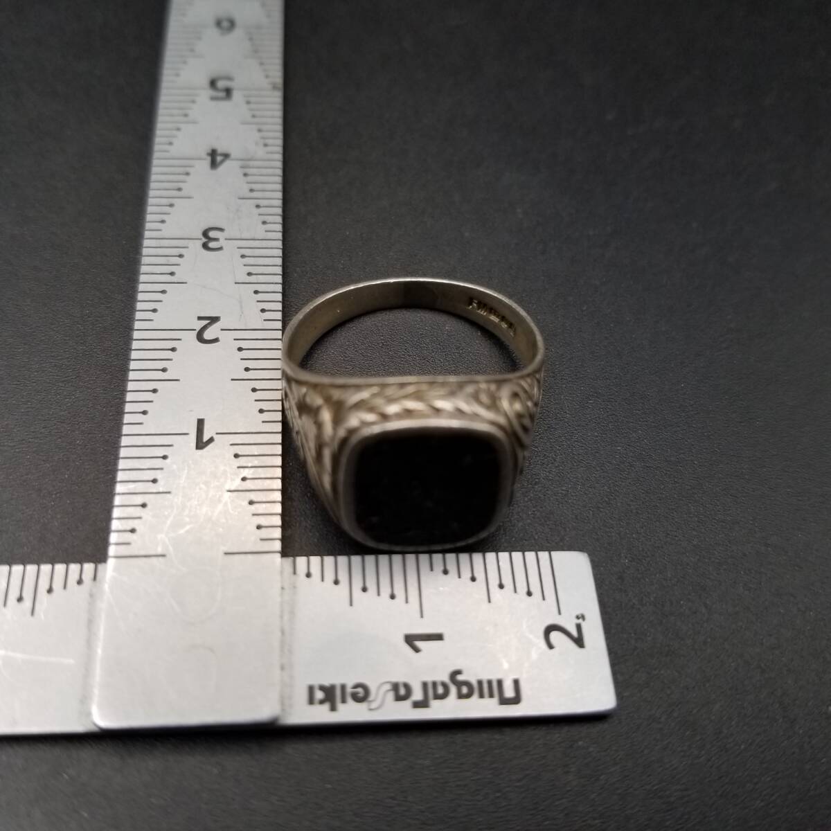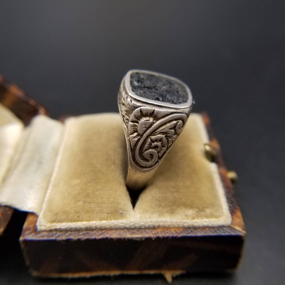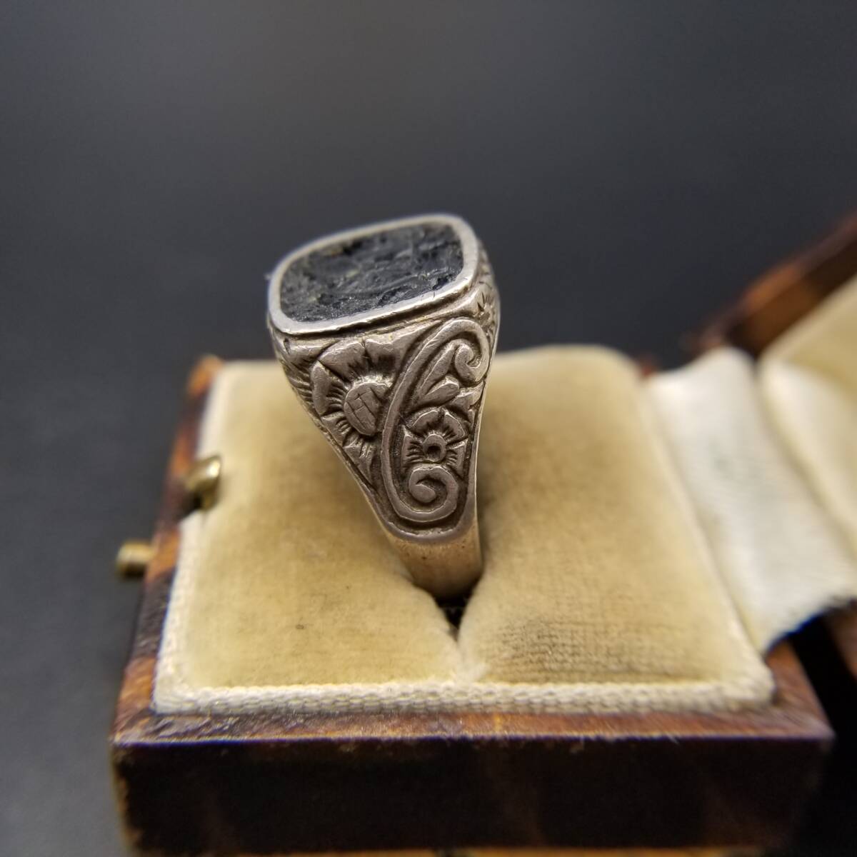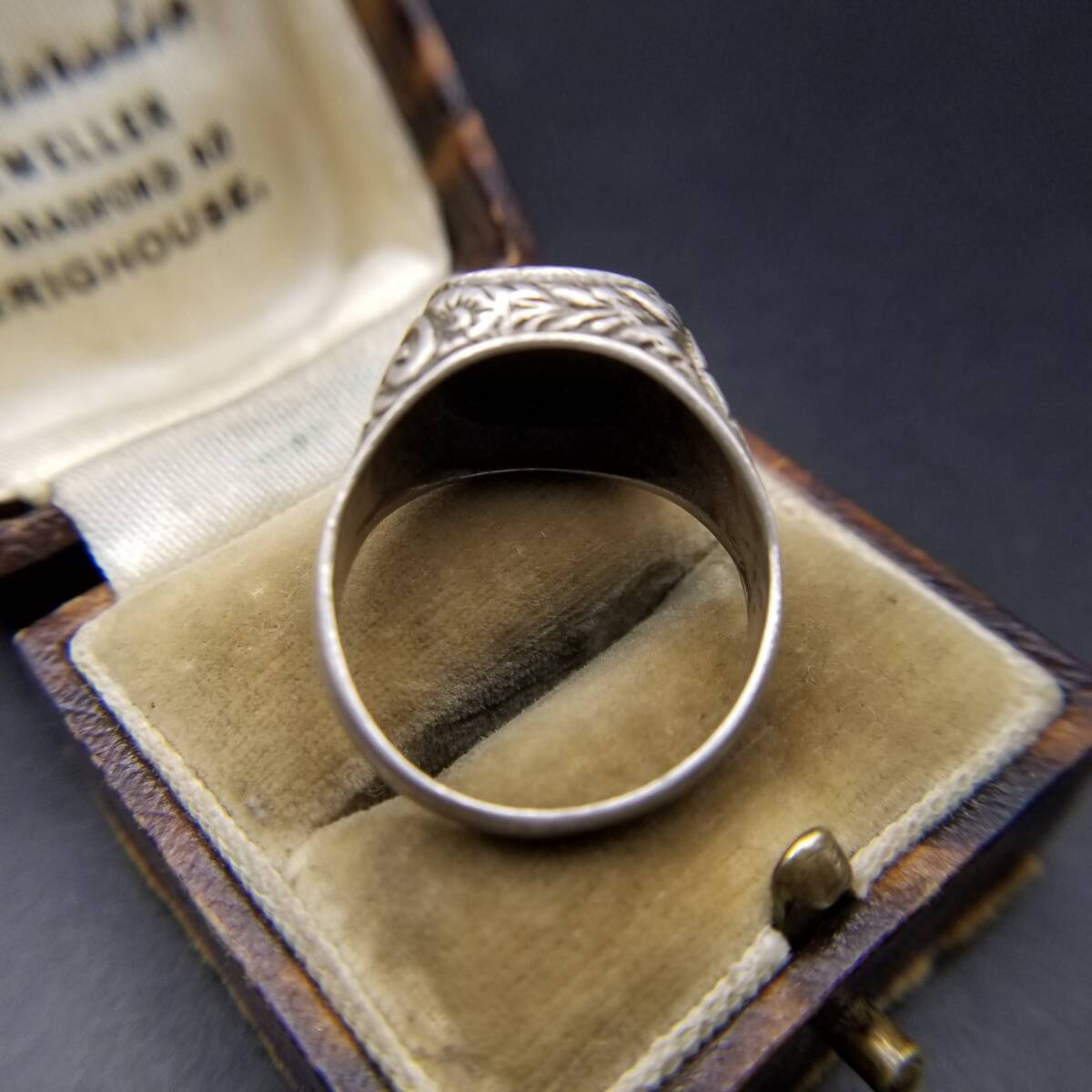 1976年 英国 ヴィンテージ オニキス インレイ 925 シルバー シグネット リング 指輪 銀 お花 フローラル 彫刻 London ホールマーク Y23-Y