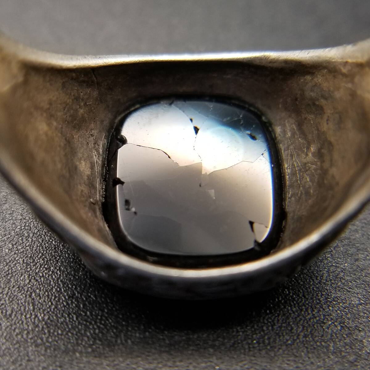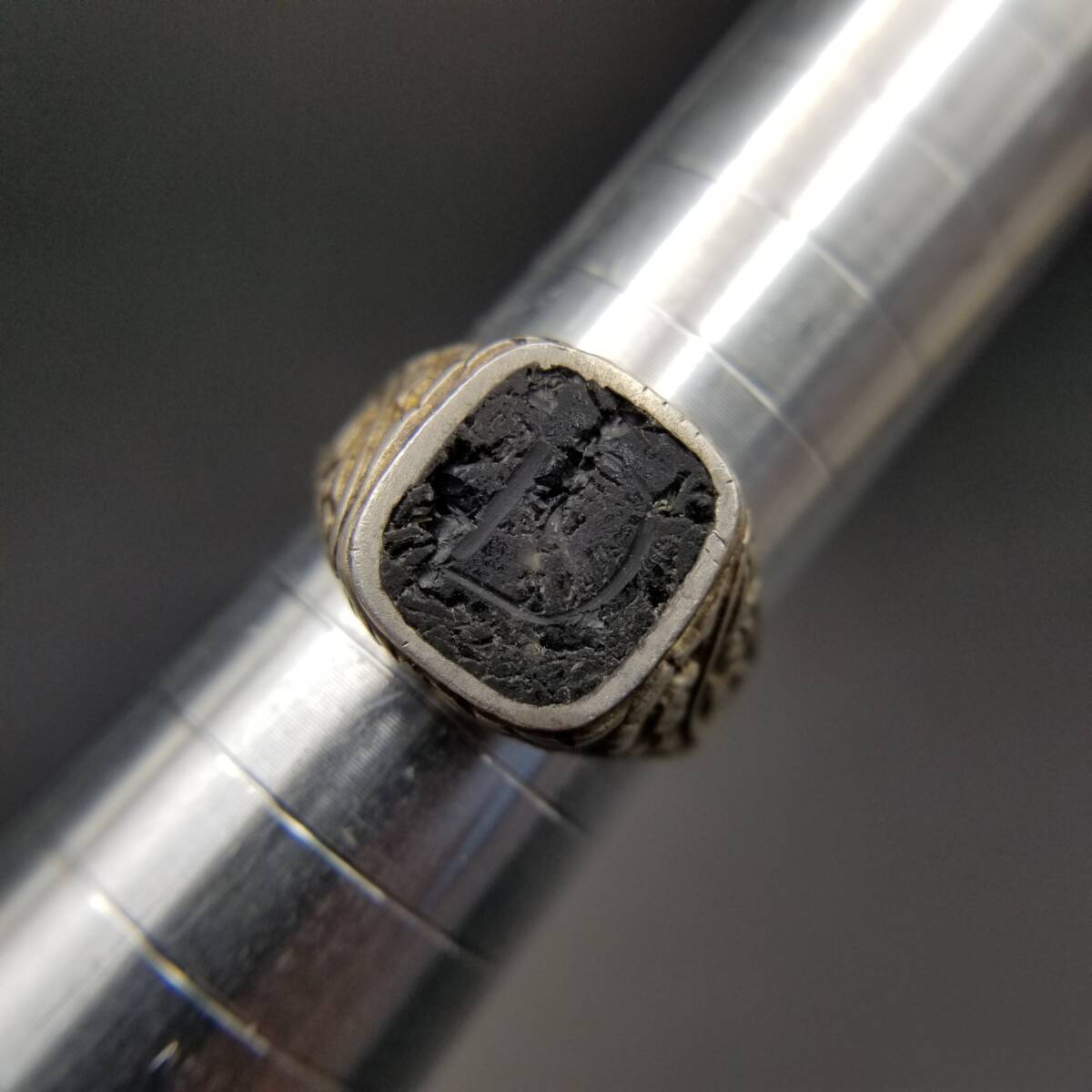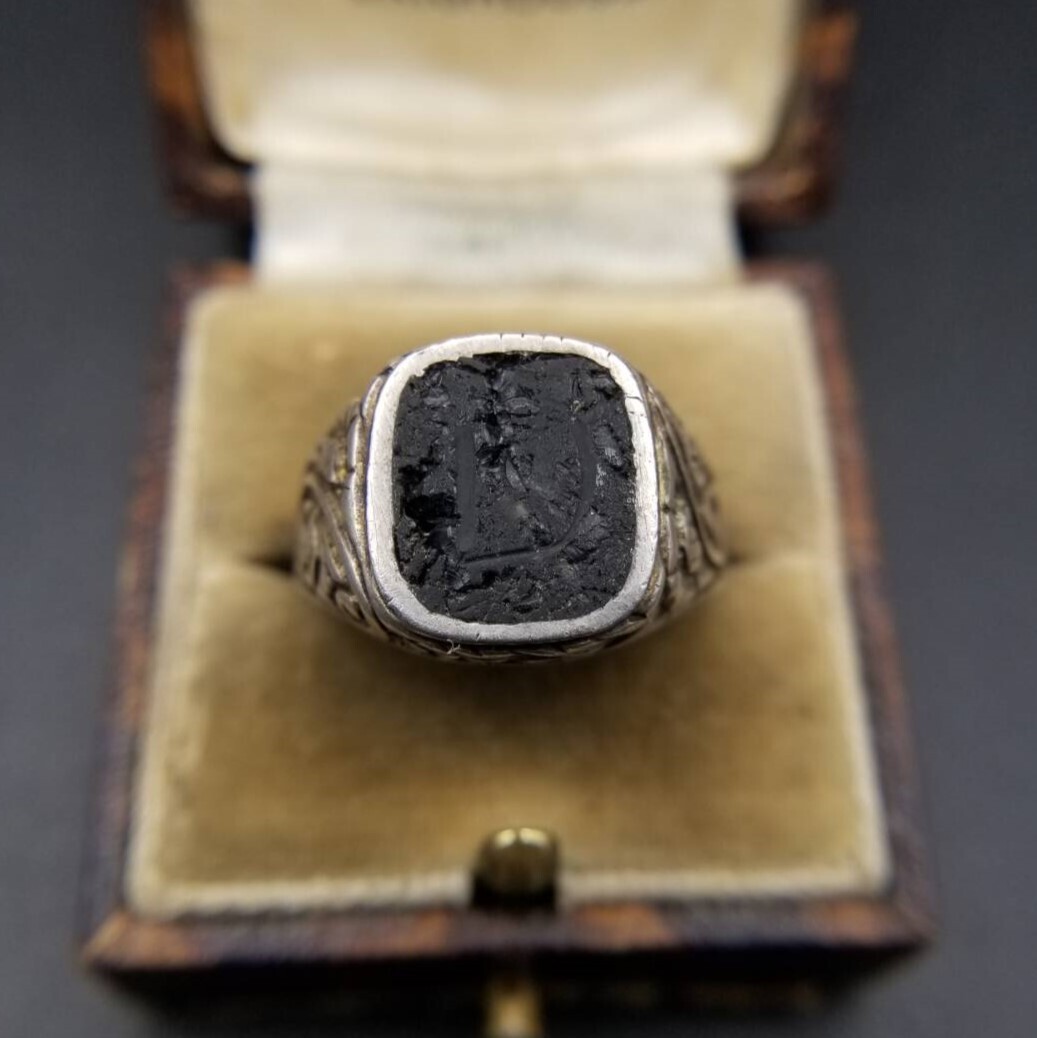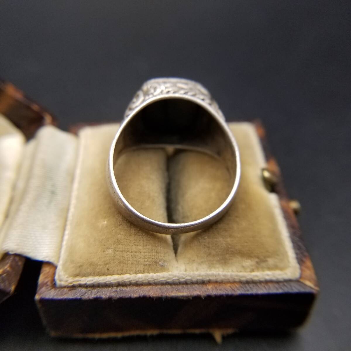 1976年 英国 ヴィンテージ オニキス インレイ 925 シルバー シグネット リング 指輪 銀 お花 フローラル 彫刻 London ホールマーク Y23-Y