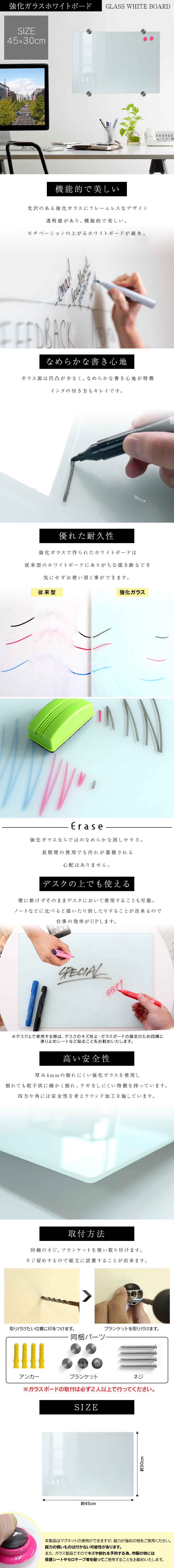 | 機能的で美しい、 フレームレスでスタイリッシュなフォルムの 強化ガラスホワイトボードです。 書き跡汚れやキズに強いガラス製ボードを採用。 長時間の使用でも汚れが蓄積される心配はありません。 凹凸の少ないガラス面は非常に滑らかで、 書いても消してもストレスフリーな使い心地。 壁掛けだけでなく、デスク上でもお使いいただけます。 ノートを取るようなスムーズな使い心地で。 自宅用にちょっとしたメモ書きやインテリアとしてもおススメです。 【商品仕様】 サイズ(約):幅450×高さ300×厚み4mm 素材:強化ガラス ボード重量:約1.6kg 【商品内容】 ガラスボード×1 取付ブランケット×4 ネジ×4 アンカー×4 ※デスク上で使用する際は、デスクのキズ防止・ガラスボードの固定のために四隅に滑り止めシートなど貼ることをお勧めします。 ※本製品はマグネットの使用ができますが、磁力が強めのものをご使用ください。磁力の弱いものは付かない可能性があります。 ガラス製品ですのでキズや割れを予防する為、市販の物には保護シートやセロテープ等を貼ってご使用することをお勧めします。 |