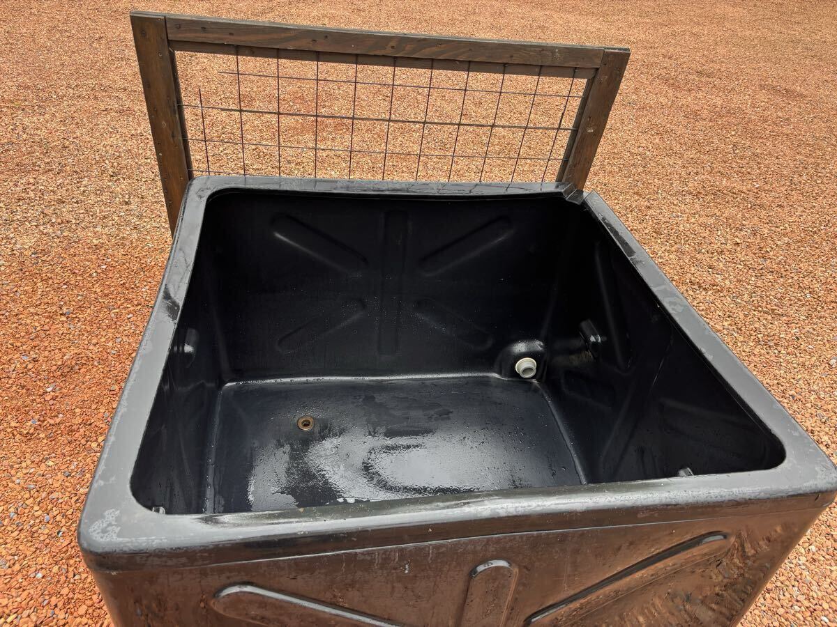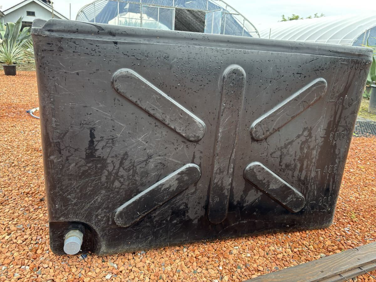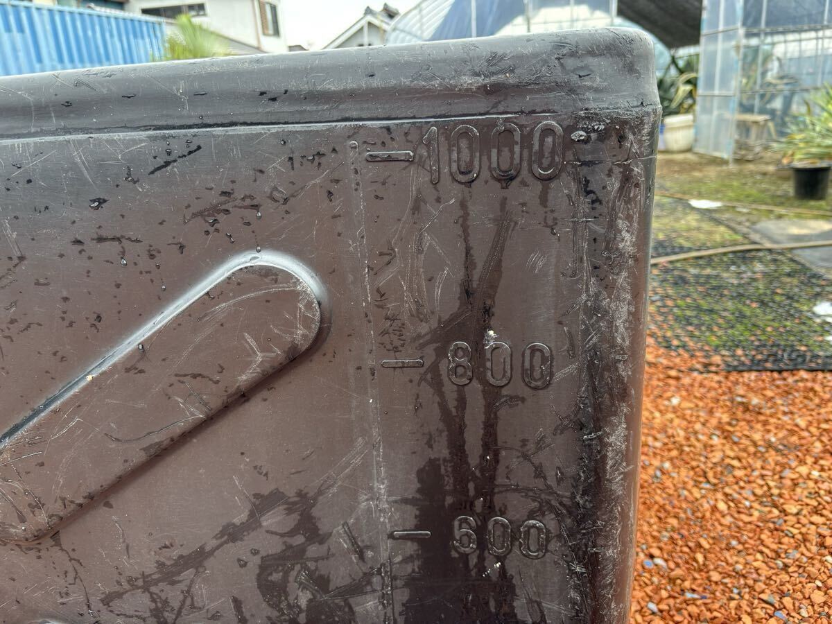 屋外で大型の亀の飼育に使ってました。正方形で約1200×800(H)になり水量は1000リットルです。使用に伴う小傷はありますが、使用する上での致命的な傷や穴などはありませんが底に風呂栓の取り付け加工、側面にはオーバーフローの加工を施してあります。