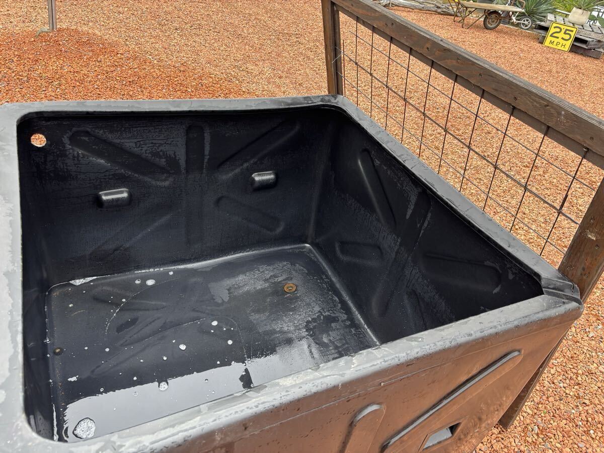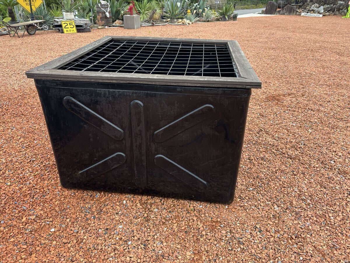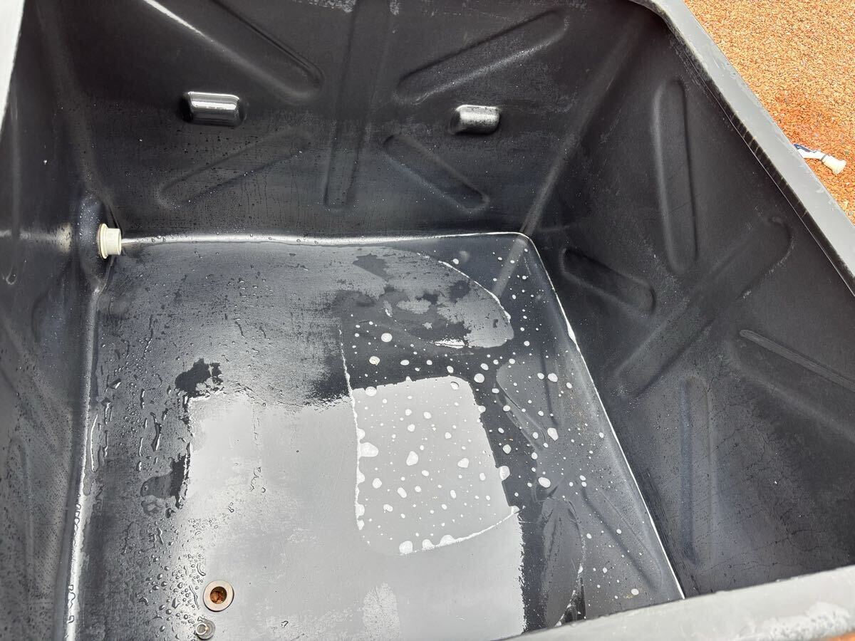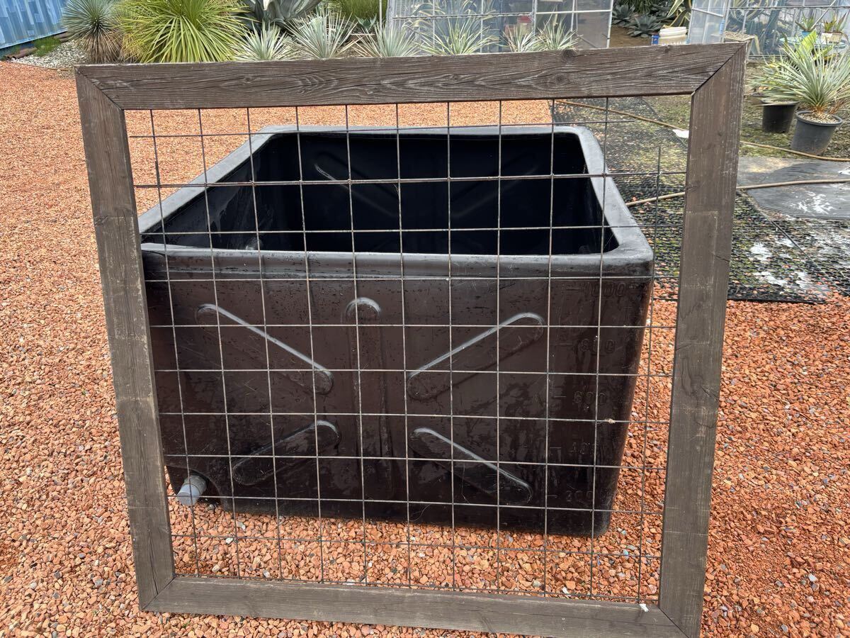 屋外で大型の亀の飼育に使ってました。正方形で約1200×800(H)になり水量は1000リットルです。使用に伴う小傷はありますが、使用する上での致命的な傷や穴などはありませんが底に風呂栓の取り付け加工、側面にはオーバーフローの加工を施してあります。