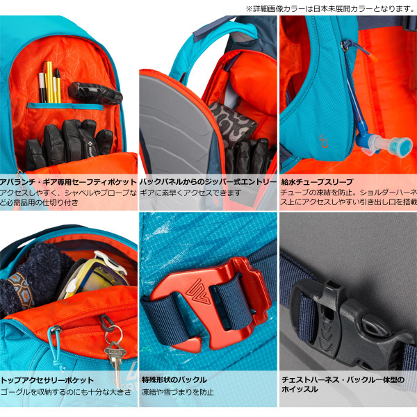 このモデルはバックカントリーに特化された作りになっており、各種ギアとボード(またはスキー)を取り付けるストラップが十分に備わっています。詳しくは画像をご確認ください。